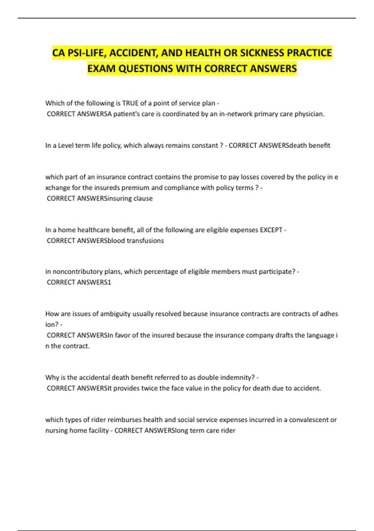 CA PSI-LIFE, ACCIDENT, AND HEALTH OR SICKNESS PRACTICE EXAM QUESTIONS WITH CORRECT