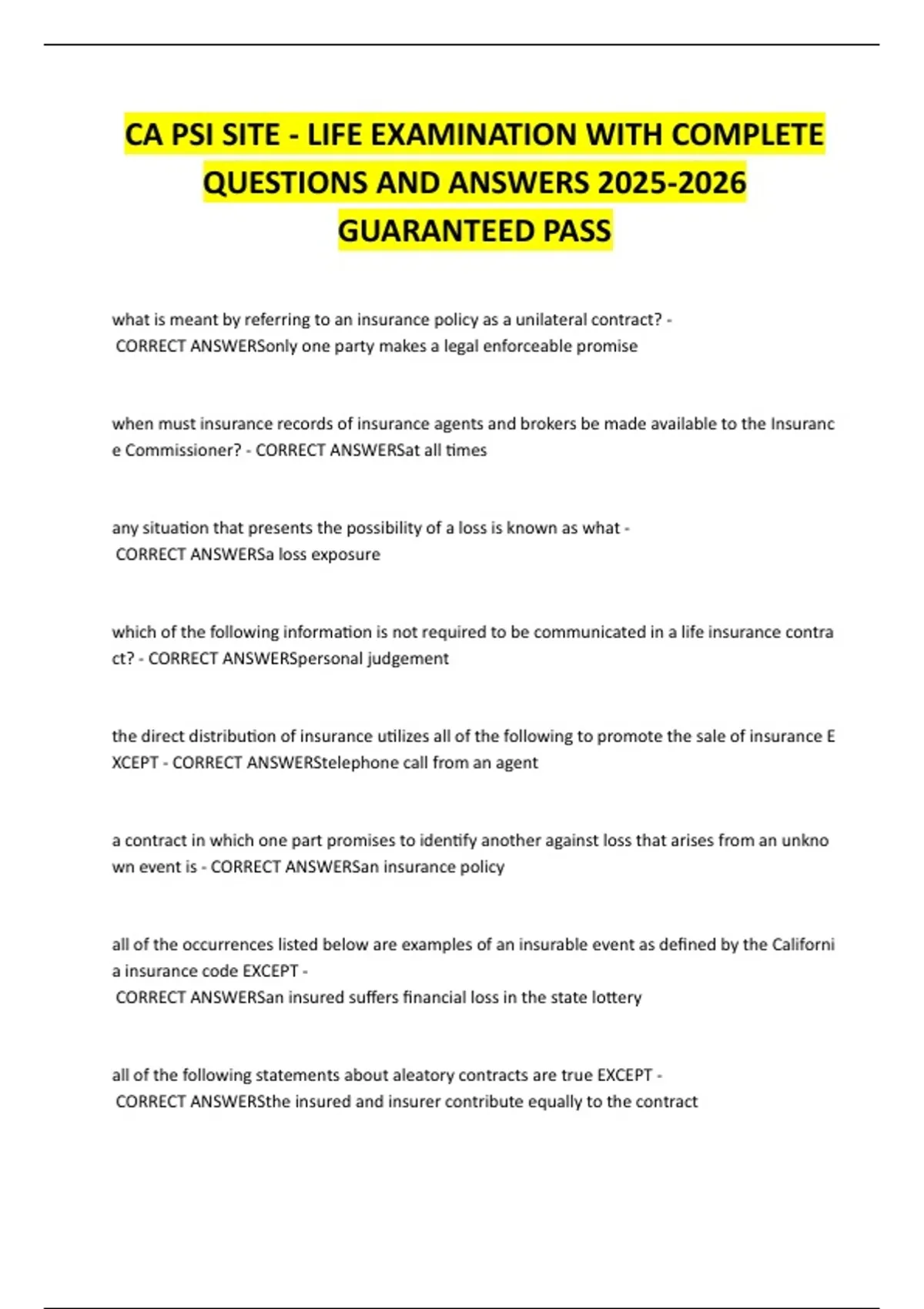 CA PSI SITE - LIFE EXAMINATION WITH COMPLETE QUESTIONS AND ANSWERS