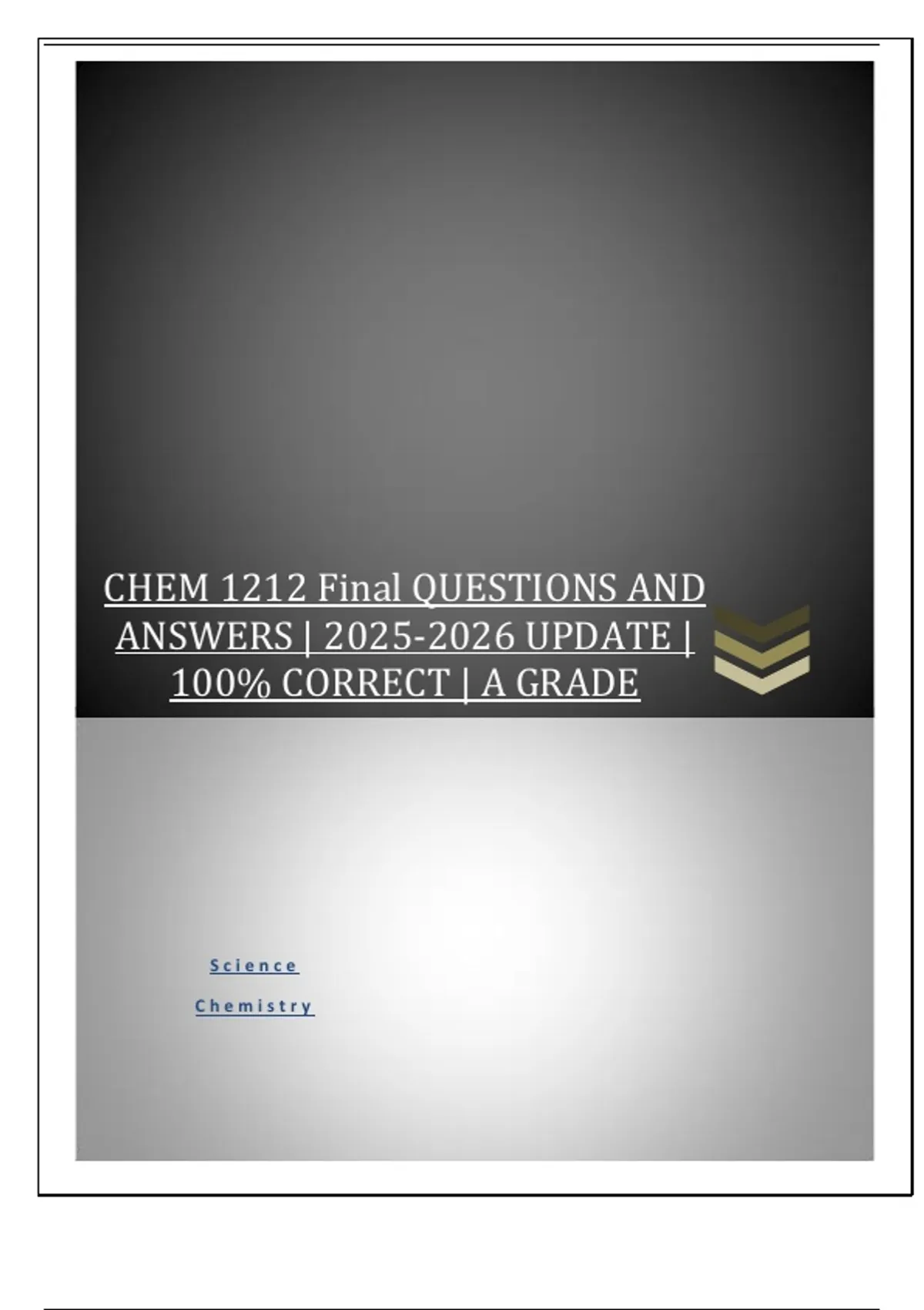 CHEM 1212 Final QUESTIONS AND ANSWERS | UPDATE | 100% CORRECT | A GRADE Indie, Cate, & Ora tested a new indicator to determine its pH range and color changes. The solution used in the experiment was colorless and acidic at pH 1. They added 2 drops of erythrosine indicator to the solution, which turned orange. This is the initial observation for the pH and color. Next they added NaOH to increase the pH, and recorded the pH and color data below. pH 1 - orange (initial observation) pH 2 - orange pH 4 - red pH 6 - red pH 8 - red What is the pH range of the indicator? - Correct Answer-pH 2-4 Indie, Cate, & Ora tested a new indicator to determine its pH range and color changes. The solution used in the experiment was colorless and acidic at pH 1. They added 2 drops of erythrosine indicator to the solution, which turned orange. This is the initial observation for the pH and color. Next they added NaOH to increase the pH, and recorded the pH and color data below. pH 1 - orange (initial observation) pH 2 - orange pH 4 - red pH 6 - red pH 8 - red What is the first color change for this indicator? ...