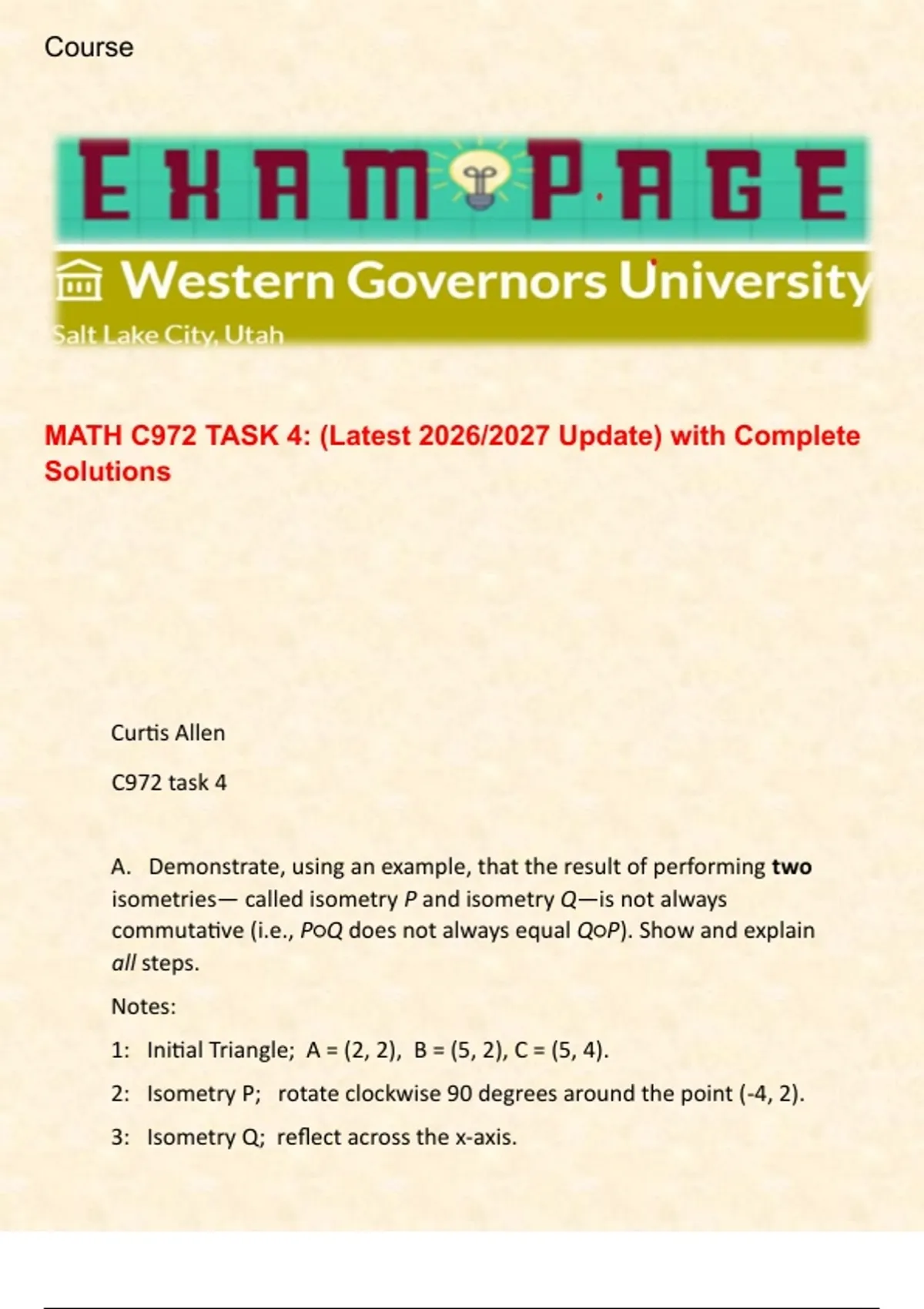 MATH C972 TASK 4: (Latest 2026/2027 Update) with Complete Solutions Curtis Allen C972 task 4 A. Demonstrate, using an example, that the result of performing two isometries— called isometry P and isometry Q—is not always commutative (i.e., P○Q does not always equal Q○P). Show and explain all steps. Notes: 1: Initial Triangle; A = (2, 2), B = (5, 2), C = (5, 4). 2: Isometry P; rotate clockwise 90 degrees around the point (-4, 2). 3: Isometry Q; reflect across the x-axis. An example figure is established. Triangle ABC, consisting of point A (2, 2), B (5, 2), and C (5, 4). Isometries for P○Q and Q○P will be taken from this figure (ABC). Evaluation P○Q: The initial step is evaluating the isometry Q; (with the triangle ABC), isometry Q is reflected across the X-axis. This created A’B’C’ at points A’ (2, -2), B’ (5, -2), C’ (5, -4).