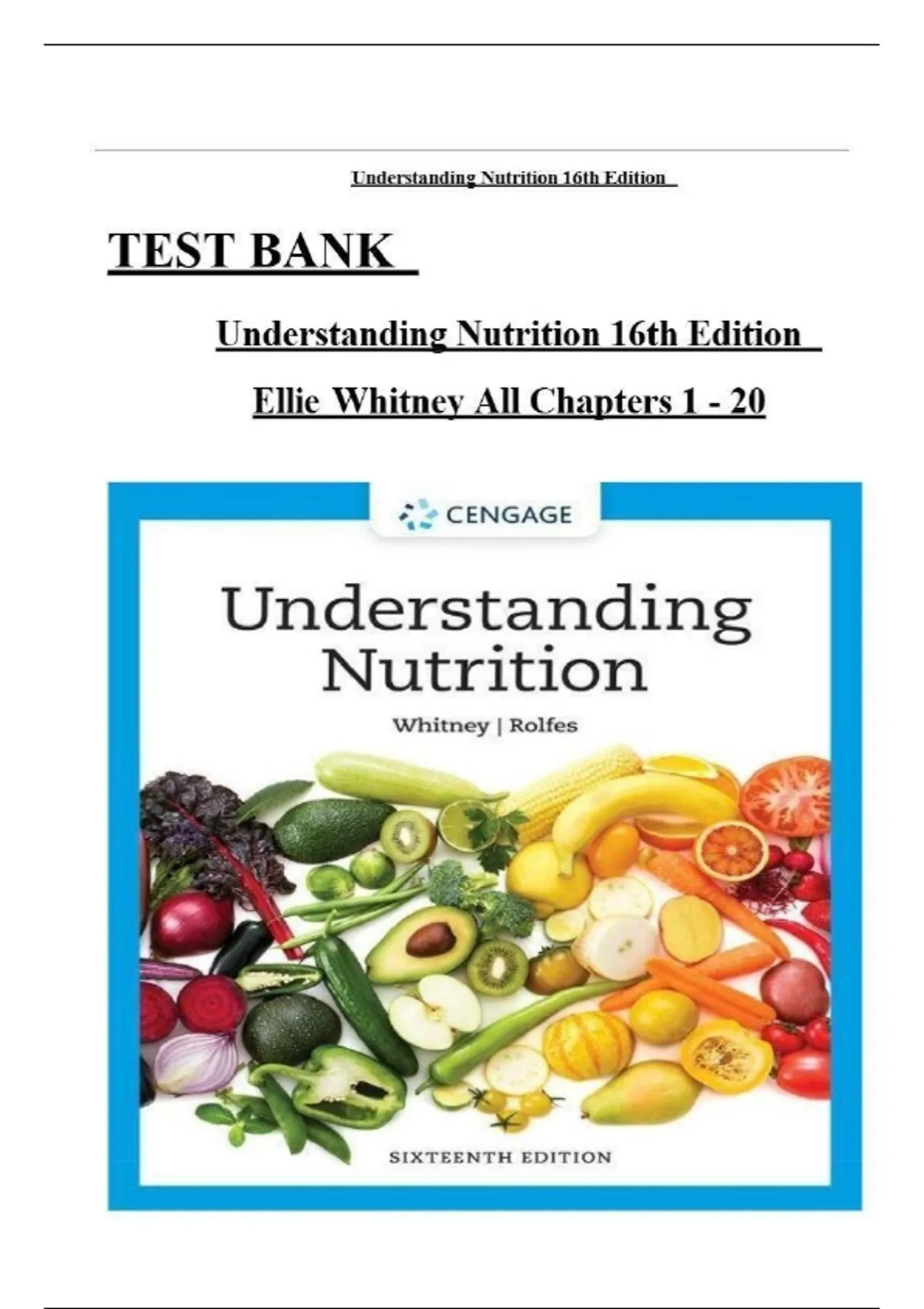 COMPLETE and VERIFIED Test Bank for Understanding Nutrition, 16th Edition by Ellie Whitney & Sharon Rolfes. Ideal for Nutrition 101 and Health Science courses. Includes comprehensive practice questions (Multiple Choice with reference pages) for ALL Chapters (1-20). Use this ultimate exam prep resource for guaranteed chapter mastery and a top grade