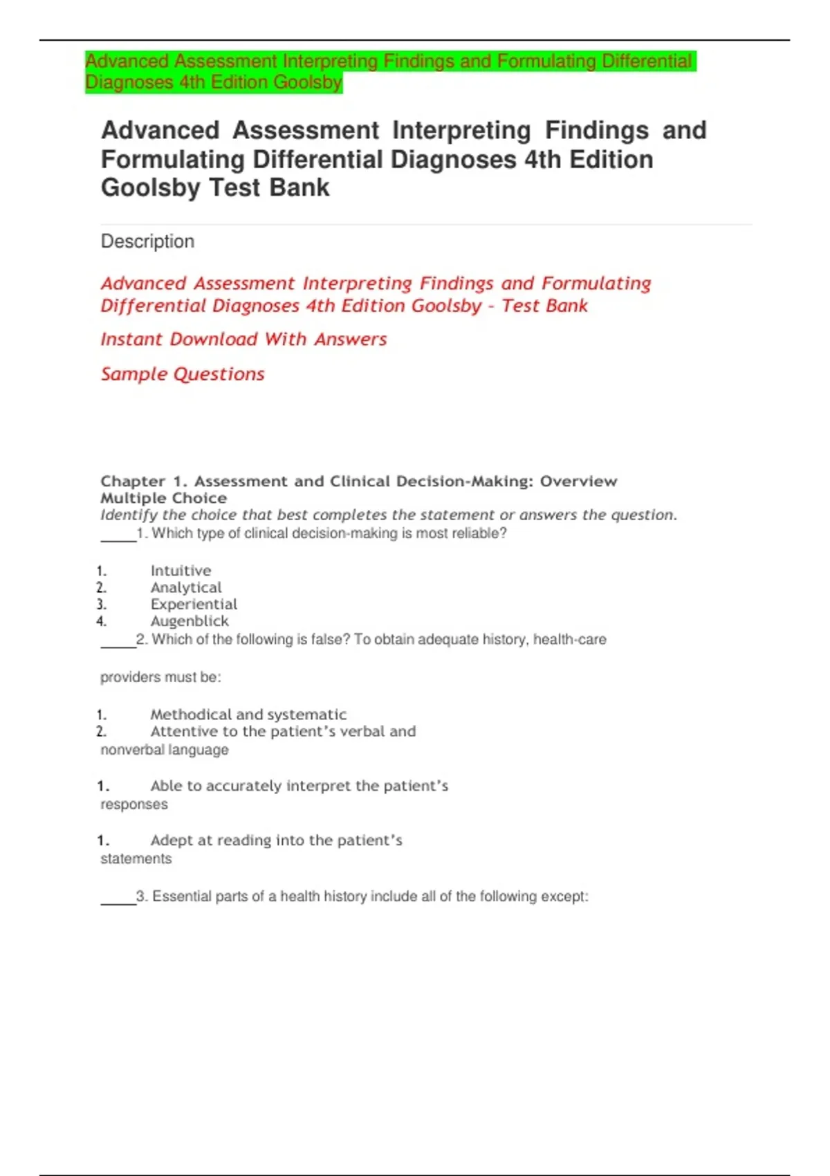 Differential Diagnoses 4th Edition Goolsby – Test Bank