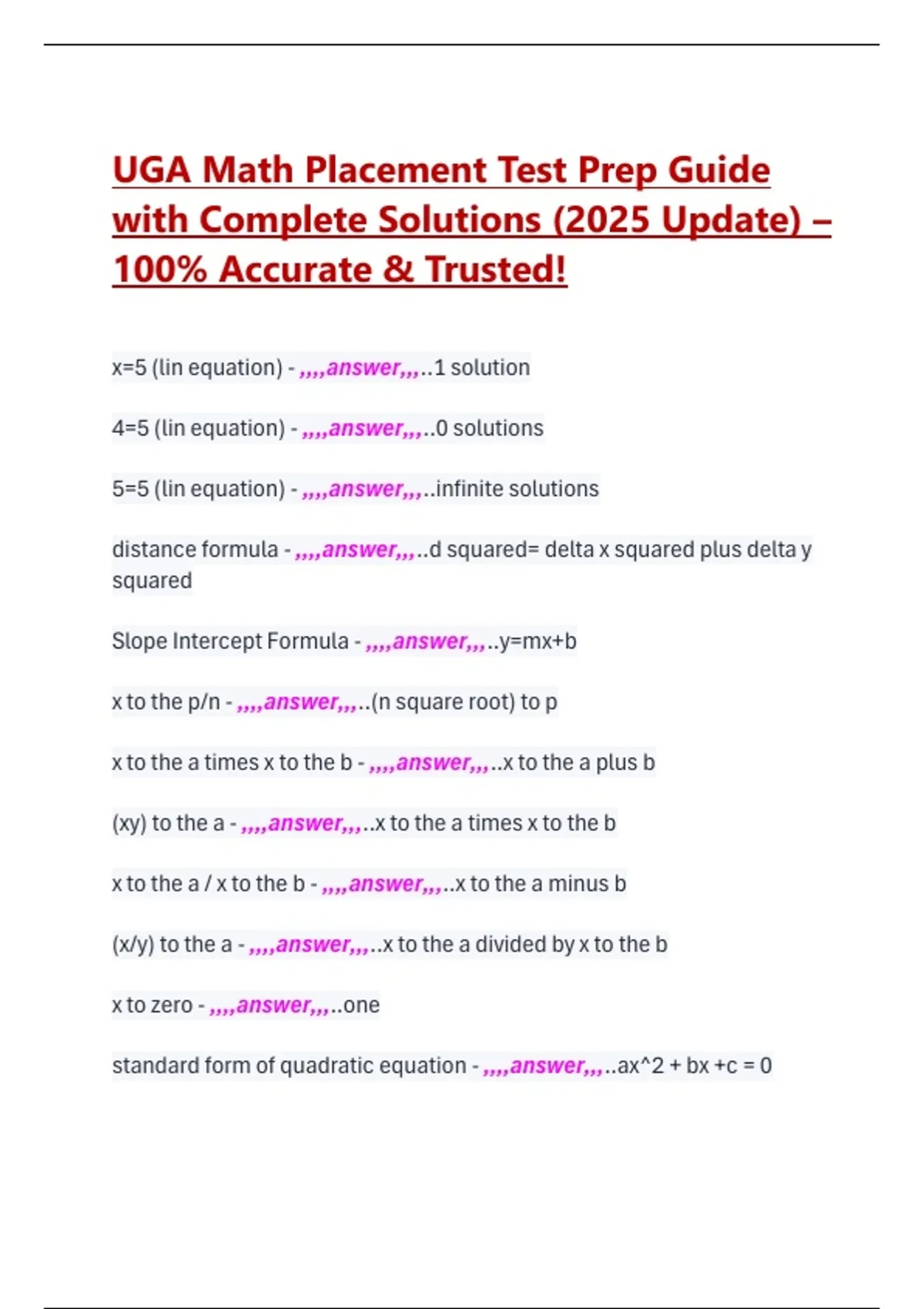 UGA Math Placement Test Prep Guide with Complete Solutions (2025 Update) – 100% Accurate & Trusted! x=5 (lin equation) - ,,,,answer,,,..1 solution