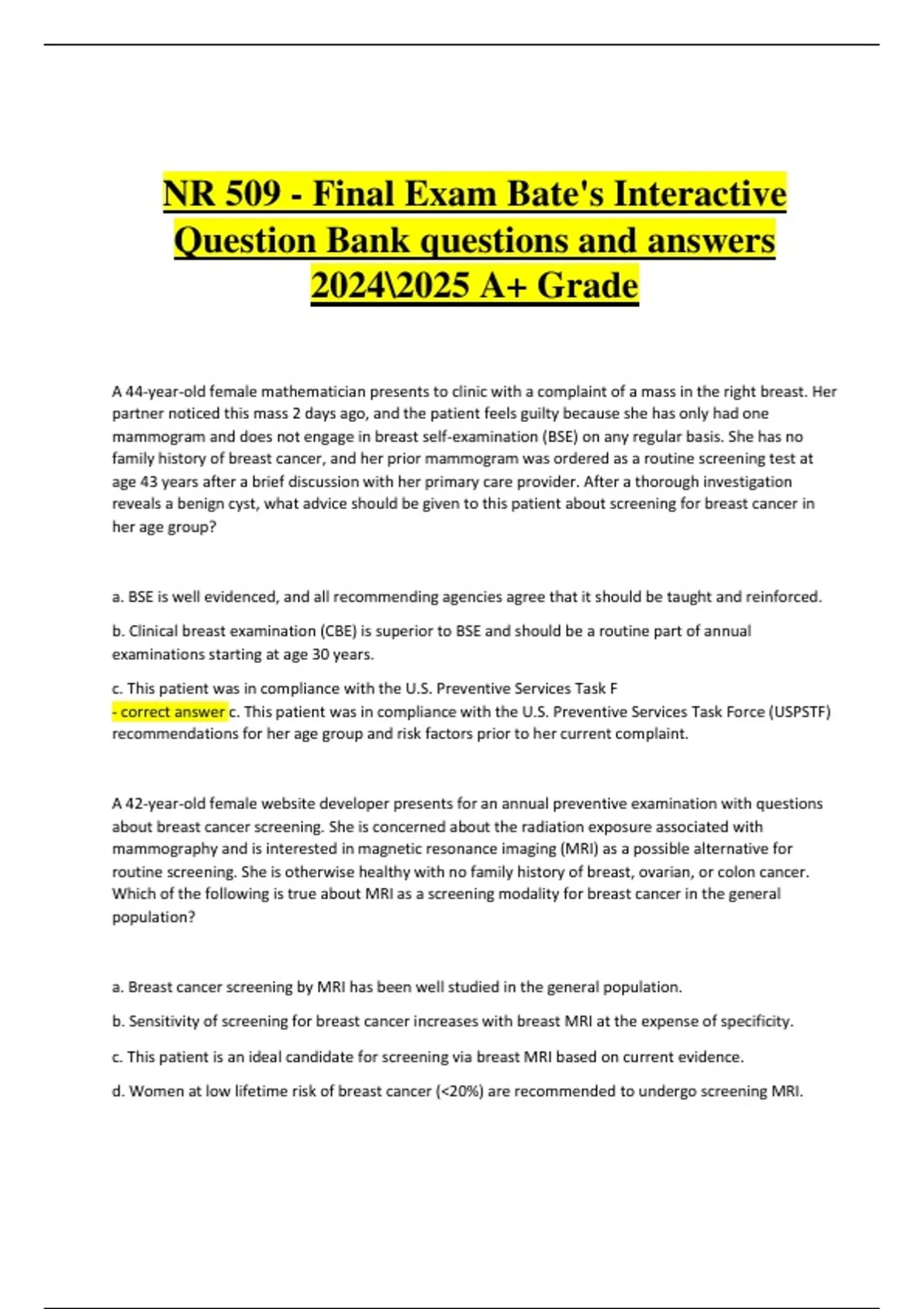 The NR 509 – Final Exam Bate’s Interactive Question Bank (2024/2025 Edition) is a verified, A+ graded study resource that compiles 100+ multiple-choice questions with correct answers and rationales. It is based on Bate’s Guide to Physical Examination and History Taking and prepares Chamberlain University nursing students for the Advanced Health Assessment final exam with a 100% pass guarantee.NR 509 – Advanced Physical Assessment is a graduate-level course at Chamberlain University. The Final Exam evaluates comprehensive knowledge of history-taking, physical examination, diagnostic reasoning, and clinical decision-making across the lifespan. The Bate’s Interactive Question Bank is a trusted exam prep tool that mirrors the style and rigor of the actual NR 509 final. It includes evidence-based questions aligned with Bate’s Guide to Physical Examination and History Taking, ensuring students are tested on the same clinical reasoning skills required in practice.