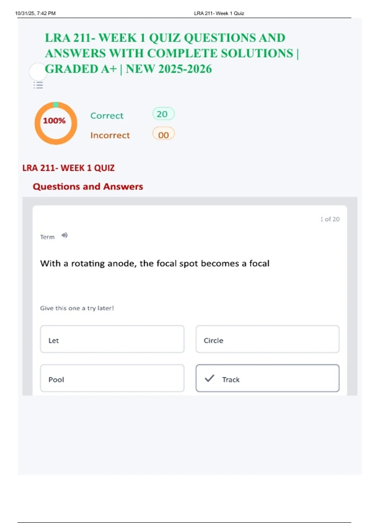 10/31/25, 7:42 PM LRA 211- Week 1 Quiz