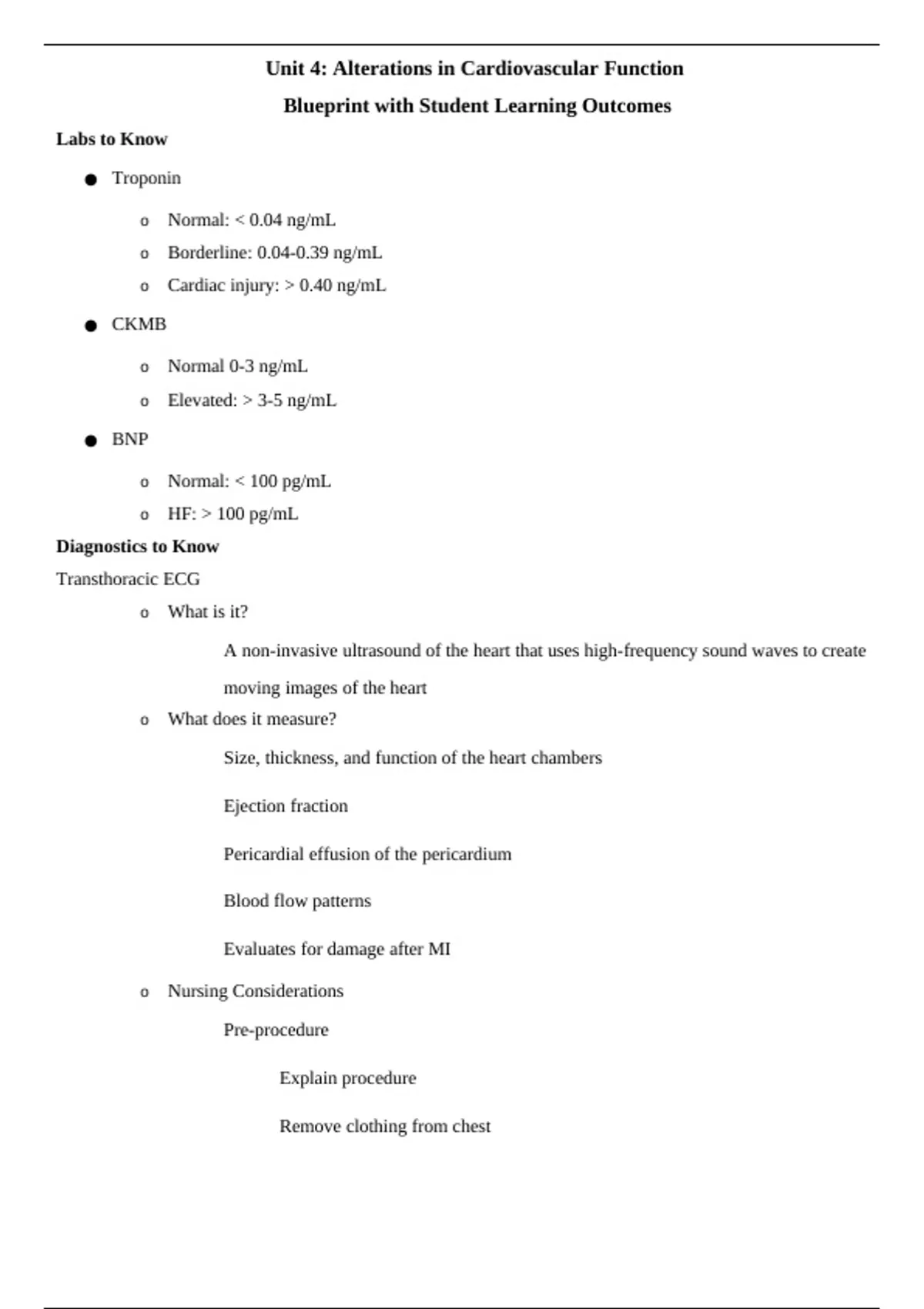 This study guide shows levels for different cardiac enzymes, different cardiac conditions, and what medications help them.