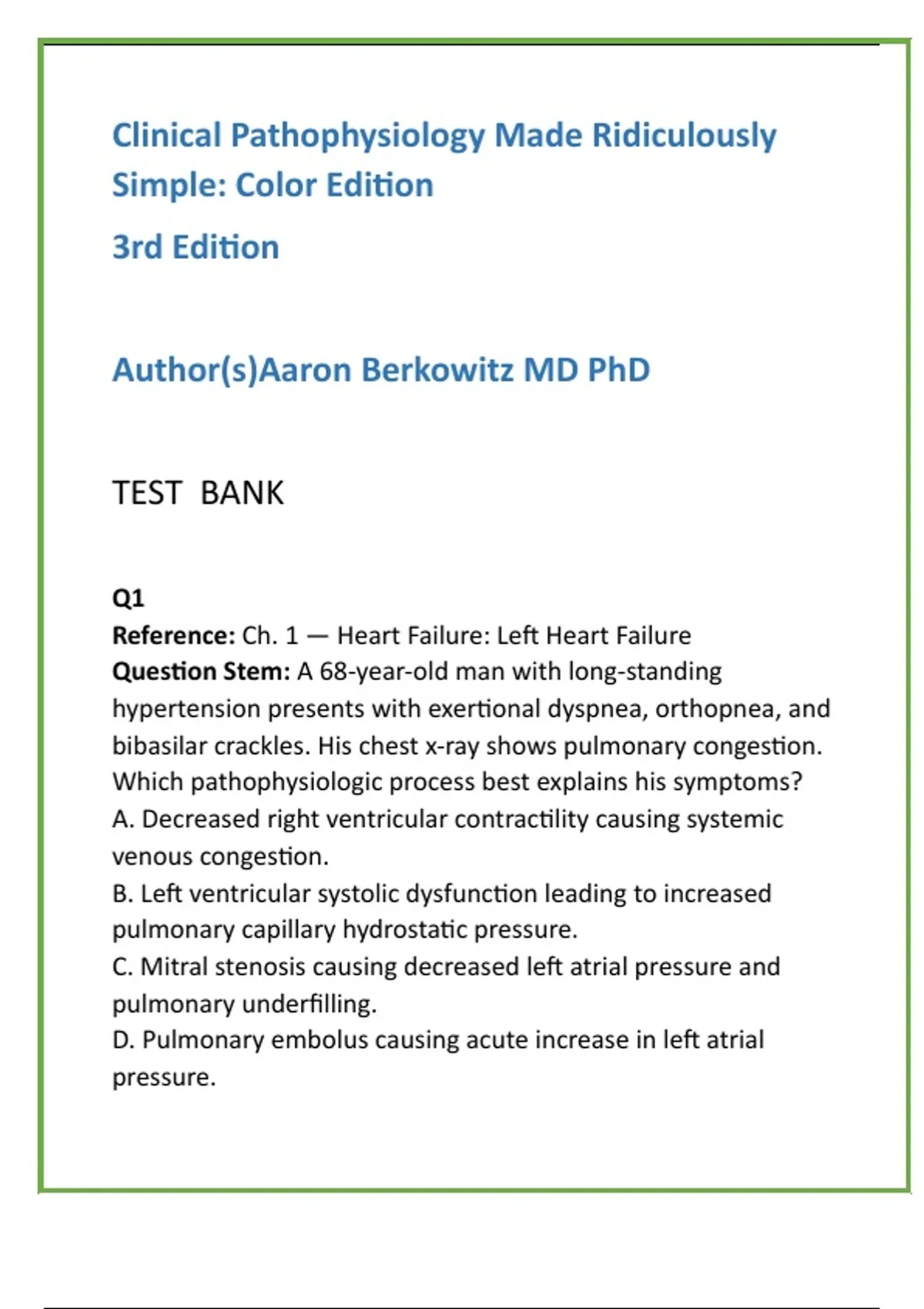 Clinical Pathophysiology Test Bank (3rd Ed. — Berkowitz) — Complete NCLEX/HESI Review with 20 MCQs/Chapter, Verified Rationales 2) Persuasive SEO Description (300–400 words) Master the ‘why’ behind every disease with a focused, exam-ready study tool: the Clinical Pathophysiology Test Bank (3rd Ed. — Berkowitz). Nursing students and allied health learners often struggle to translate textbook mechanisms into clinical decisions—this test bank converts Berkowitz’s clear, illustrated explanations into practice-ready application and exam performance. Designed to mirror NCLEX® and HESI® exam style and clinical thinking, each major chapter includes 20 original, evidence-based MCQs with verified answers and rationales authored by experienced pathophysiology and nursing educators. Questions emphasize disease mechanisms (cell injury, inflammation and repair), fluid and electrolyte homeostasis, organ-system dysfunction, and the nursing implications that guide assessment, prioritization, and safe interventions. Every item pairs a concise clinical vignette with application-level reasoning so you learn to interpret signs, labs, hemodynamics, and patient safety priorities—not just memorize facts. Use it to build diagnostic intuition, strengthen clinical reasoning, and prepare for high-stakes exams. This is the practical NCLEX Pathophysiology Review that helps you connect normal physiology to pathology and to everyday bedside care. Format & instructor features: downloadable PDF and CSV for item banks, chapter-indexed questions for targeted review, instructor keys with suggested difficulty tiers, and printable practice tests. Faculty and course directors can easily integrate these chapter-indexed questions into quizzes, formative assessments, or NGN-style case reviews. Key benefits • 20 NCLEX/HESI-style questions per major chapter for comprehensive coverage • Verified rationales explaining correct answers and distractors with clinical teaching points • Focused sections on cardiovascular, respiratory, renal, metabolic, infectious, and neurologic pathophysiology • Designed for Nursing Pathophysiology mastery, exam readiness, and clinical application • Ideal for nursing, pre-nursing, physician-assistant, and allied health students and educators Start mastering Clinical Pathophysiology today — one mechanism at a time. Use this as your go-to NCLEX Pathophysiology Review tool during focused study sprints. Practice daily, review rationales, and watch your clinical judgment improve. Download now and convert knowledge into confident patient care and exam success. 3) 10 High-Visibility Hashtags #ClinicalPathophysiology #NursingStudents #PathophysiologyTestBank #Berkowitz #MadeRidiculouslySimple #NCLEXReview #HESIPrep #NursingSchool #StudySmarter #NursingPathophysiology 4) 20 SEO Keywords / Key Phrases Clinical Pathophysiology Test Bank Berkowitz pathophysiology questions NCLEX pathophysiology review Pathophysiology Made Ridiculously Simple test bank Verified rationales pathophysiology Nursing pathophysiology MCQs Clinical reasoning quiz bank Human disease mechanisms review Medical pathophysiology practice questions Pathophysiology for nurses Body system disorders practice test Inflammation and repair questions Electrolyte imbalance quiz Cardiovascular and renal pathophysiology test NCLEX HESI practice questions pathophysiology Pre-nursing pathophysiology study material Clinical A&P review questions Cellular injury and repair questions High-yield pathophysiology question bank NGN-style pathophysiology case questions