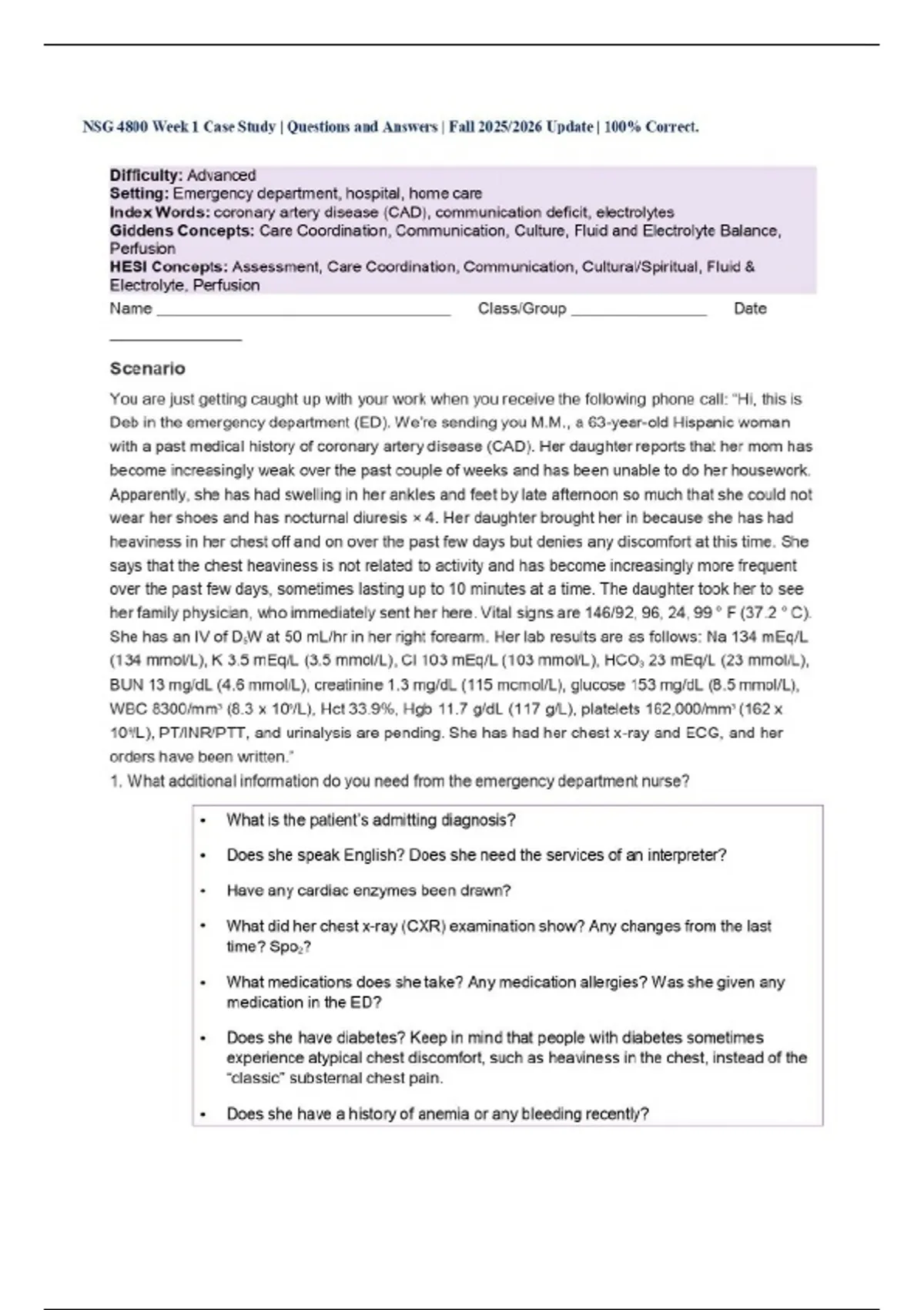 NSG 4800 Week 1 Case Study | Questions and Answers | Fall 2025/2026 Update | 100% Correct.