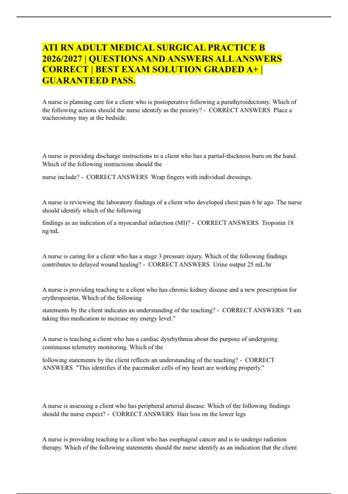 ATI RN ADULT MEDICAL SURGICAL PRACTICE B 2026/2027 | QUESTIONS AND ANSWERS ALL ANSWERS CORRECT | BEST EXAM SOLUTION GRADED A+ | GUARANTEED PASS. A nurse is planning care for a client who is postoperative following a parathyroidectomy. Which of the following actions should the nurse identify as the priority? - CORRECT ANSWERS Place a tracheostomy tray at the bedside. A nurse is providing discharge instructions to a client who has a partial-thickness burn on the hand. Which of the following instructions should the nurse include? - CORRECT ANSWERS Wrap fingers with individual dressings. A nurse is reviewing the laboratory findings of a client who developed chest pain 6 hr ago. The nurse should identify which of the following findings as an indication of a myocardial infarction (MI)? - CORRECT ANSWERS Troponin 18 ng/mL A nurse is caring for a client who has a stage 3 pressure injury. Which of the following findings contributes to delayed wound healing? - CORRECT ANSWERS Urine output 25 mL/hr A nurse is providing teaching to a client who has chronic kidney disease and a new prescription for erythropoietin. Which of the following statements by the client indicates an understanding of the teaching? - CORRECT ANSWERS "I am taking this medication to increase my energy level." A nurse is teaching a client who has a cardiac dysrhythmia about the purpose of undergoing continuous telemetry monitoring. Which of the following statements by the client reflects an understanding of the teaching? - CORRECT ANSWERS "This identifies if the pacemaker cells of my heart are working properly." A nurse is assessing a client who has peripheral arterial disease. Which of the following findings should the nurse expect? - CORRECT ANSWERS Hair loss on the lower legs A nurse is providing teaching to a client who has esophageal cancer and is to undergo radiation therapy. Which of the following statements should the nurse identify as an indication that the client understands the teaching? - CORRECT ANSWERS "I will use my hands rather than a washcloth to clean the radiation area. A nurse at a provider's office is caring for a client who is 2 weeks postoperative following a gastrectomy