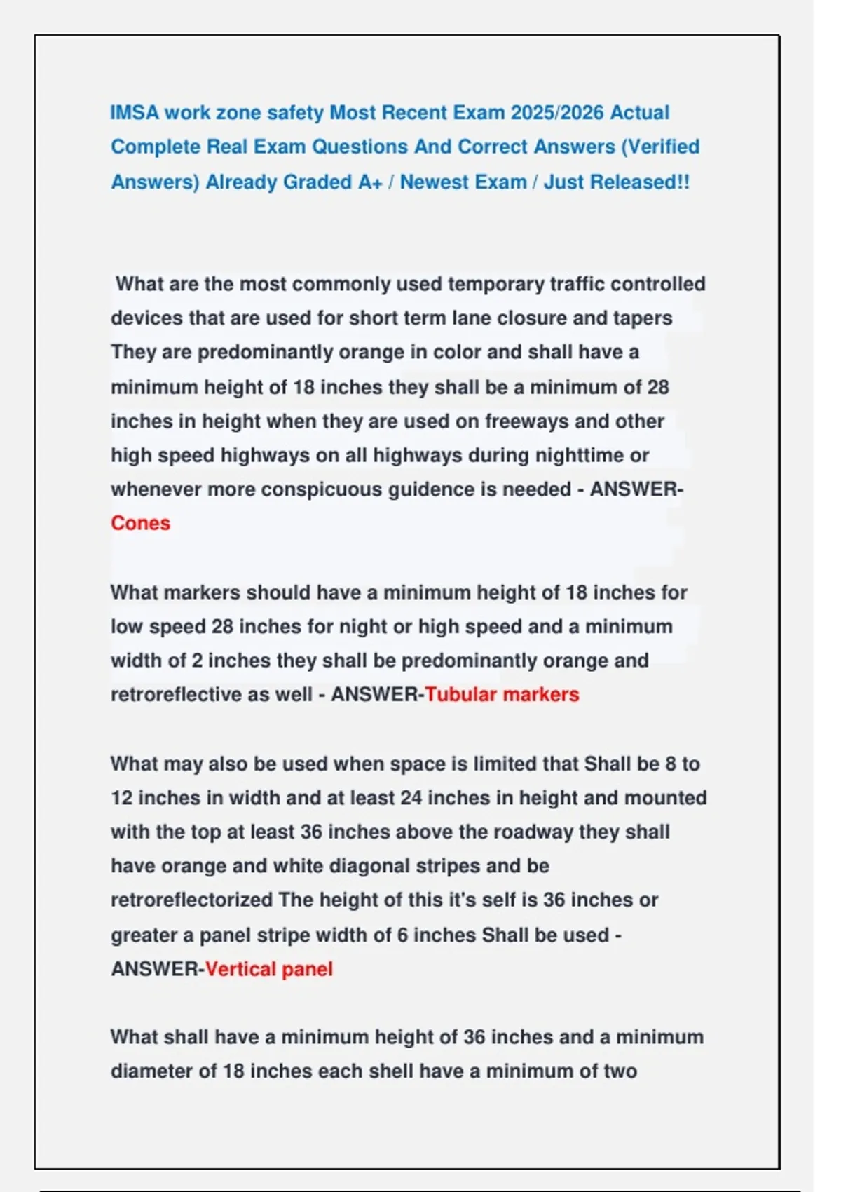 IMSA work zone safety Most Recent Exam 2025/2026 Actual Complete Real Exam Questions And Correct Answers (Verified Answers) Already Graded A+ / Newest Exam / Just Released!! IMSA work zone safety Most Recent Exam 2025/2026 Actual Complete Real Exam Questions And Correct Answers (Verified Answers) Already Graded A+ / Newest Exam / Just Released!! IMSA work zone safety Most Recent Exam 2025/2026 Actual Complete Real Exam Questions And Correct Answers (Verified Answers) Already Graded A+ / Newest Exam / Just Released!! IMSA work zone safety Most Recent Exam 2025/2026 Actual Complete Real Exam Questions And Correct Answers (Verified Answers) Already Graded A+ / Newest Exam / Just Released!! IMSA work zone safety Most Recent Exam 2025/2026 Actual Complete Real Exam Questions And Correct Answers (Verified Answers) Already Graded A+ / Newest Exam / Just Released!!