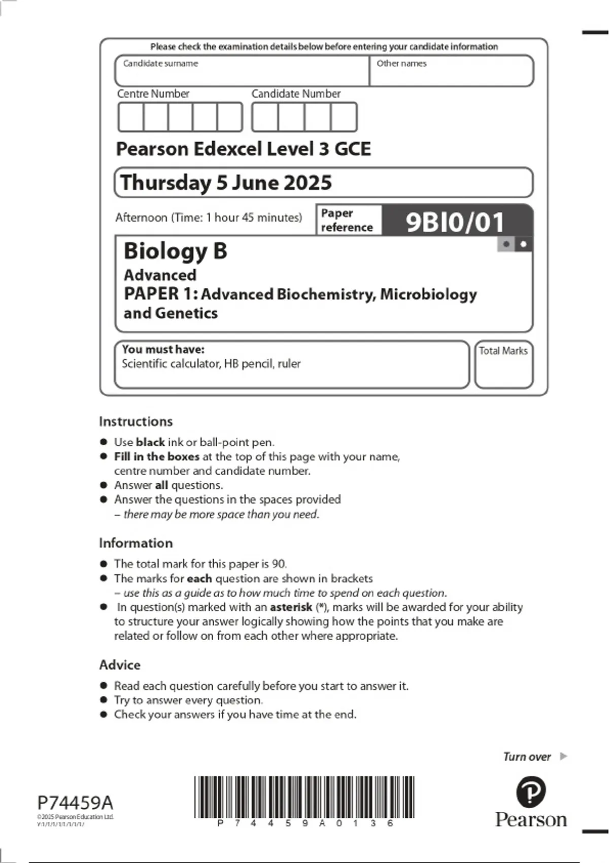 2025 Pearson Edexcel Level 3 GCE Biology B Advanced PAPER 1: Advanced Biochemistry, Microbiology and Genetics Combined Question Paper & Marking Scheme