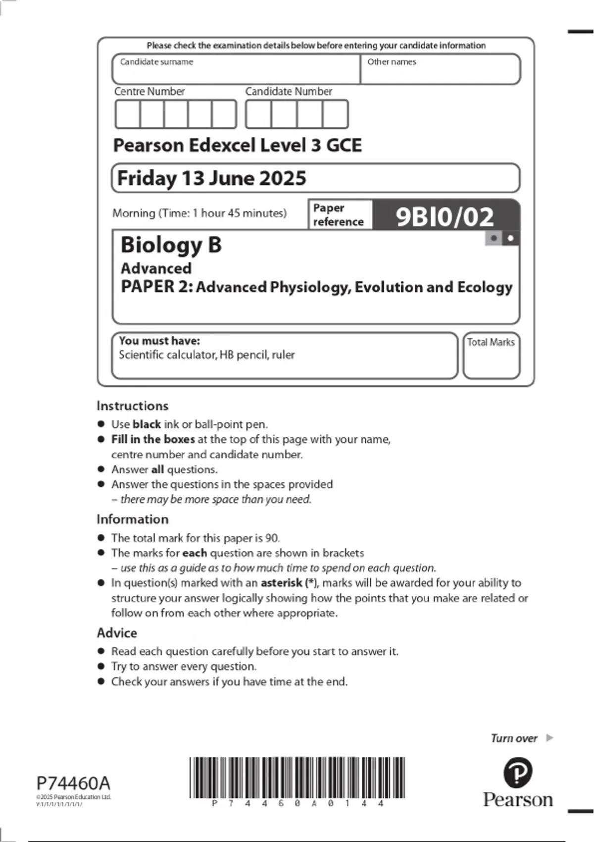 2025 Pearson Edexcel Level 3 GCE Friday 13 June 2025 Biology B Advanced PAPER 2: Advanced Physiology, Evolution and Ecology Combined Question Paper & Marking Scheme