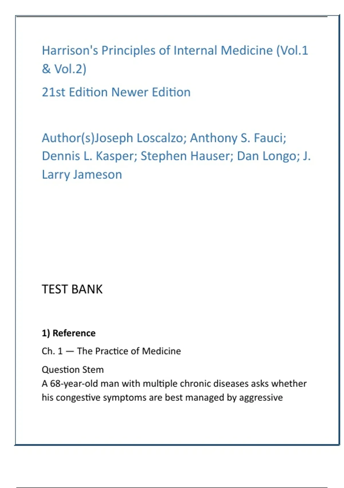 Harrison’s 21st Edition Internal Medicine Test Bank — Full Textbook, 20 MCQs/Chapter with Answers & Rationales Description: Master Internal Medicine with the definitive Harrison’s 21st Edition Test Bank — a digital, exam-focused question library designed for nurses, medical students, and clinicians preparing for NCLEX, HESI, shelf exams, and board-style testing. This premium product delivers full textbook coverage (Vol. 1 & Vol. 2) with 20 clinically realistic MCQs per chapter, each item paired with a single-best answer and evidence-based, verified rationales — ideal for active recall, clinical reasoning practice, and high-stakes exam readiness. Why this Test Bank converts learners into high-performers: it’s tightly aligned to Harrison’s authoritative content, emphasizes pathophysiology-driven scenarios, and trains prioritization, diagnostics, and patient-safety decision-making — the exact skills NCLEX/HESI and medical exams assess. Features: Complete coverage: All chapters from Harrison’s 21st Edition (Vol. 1 & Vol. 2) 20 MCQs per chapter: 100% consistent item density for predictable study cadence Answers & verified rationales: Concise, evidence-based explanations for every item Exam-focused: NCLEX / HESI / medical boards relevance with clinical vignettes Ready-to-use formats: LMS/test-bank friendly digital files for study or classroom use Builds clinical reasoning: Application → Analysis → Evaluation-level items Trusted source alignment: Based on Harrison’s Principles of Internal Medicine, 21st Ed. Get comprehensive, high-yield practice that improves scores and clinical mastery. Purchase once — study smarter, faster, and with confidence. Keywords: Harrison’s 21st edition test bank internal medicine question bank Harrison test bank full textbook 20 MCQs per chapter NCLEX internal medicine practice HESI study questions clinical reasoning MCQs medical board prep questions Hashtags: #HarrisonsTestBank #InternalMedicine #NCLEXPrep #HESIPrep #MedStudent #ClinicalReasoning #MedicalExamPrep #QuestionBank #BoardPrep #StudySmart