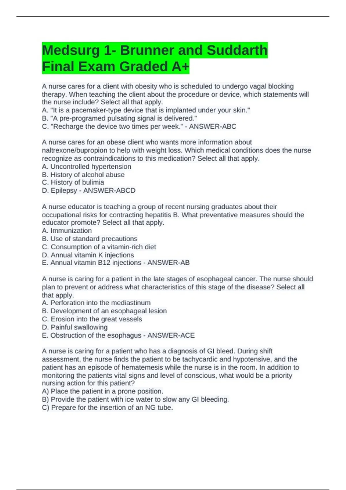 Medsurg 1- Brunner and Suddarth Final Exam Graded A+