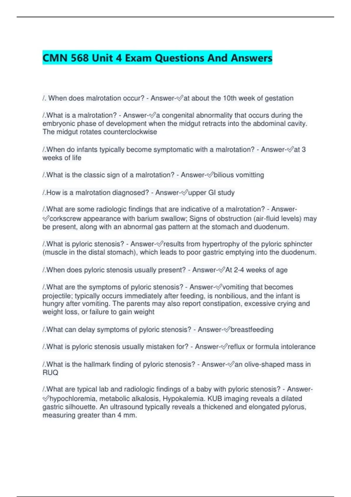 CMN 568 Unit 4 Exam Questions And Answers /. When does malrotation occur? - Answer-at about the 10th week of gestation /.What is a malrotation? - Answer-a congenital abnormality that occurs during the embryonic phase of development when the midgut retracts into the abdominal cavity. The midgut rotates counterclockwise /.When do infants typically become symptomatic with a malrotation? - Answer-at 3 weeks of life /.What is the classic sign of a malrotation? - Answer-bilious vomitting /.How is a malrotation diagnosed? - Answer-upper GI study /.What are some radiologic findings that are indicative of a malrotation? - Answer-corkscrew appearance with barium swallow; Signs of obstruction (air-fluid levels) may be present, along with an abnormal gas pattern at the stomach and duodenum. /.What is pyloric stenosis? - Answer-results from hypertrophy of the pyloric sphincter (muscle in the distal stomach), which leads to poor gastric emptying into the duodenum. /.When does pyloric stenosis usually present? - Answer-At 2-4 weeks of age /.What are the symptoms of pyloric stenosis? - Answer-vomiting that becomes projectile; typically occurs immediately after feeding, is nonbilious, and the infant is hungry after vomiting. The parents may also report constipation, excessive crying and weight loss, or failure to gain weight /.What can delay symptoms of pyloric stenosis? - Answer-breastfeeding /.What is pyloric stenosis usually mistaken for? - Answer-reflux or formula intolerance /.What is the hallmark finding of pyloric stenosis? - Answer-an olive-shaped mass in RUQ /.What are typical lab and radiologic findings of a baby with pyloric stenosis? - Answer-hypochloremia, metabolic alkalosis, Hypokalemia. KUB imaging reveals a dilated gastric silhouette. An ultrasound typically reveals a thickened and elongated pylorus, measuring greater than 4 mm. /.What is intussusception? - Answer-involves the invagination of a section of the intestine into itself. The most frequent site is at the terminal ileum. /.What is often a predisposing factor of intussusception? - Answer-A recent viral illness, mesenteric lymphadenitis, Henoch-Schonlein purpura, and cystic fibrosis /.What is the typical age of onset of idiopathic intussusception? - Answer-6 to 18 months, with an average age of 7 to 8 months /.If intussusception occurs beyond 36 mths, it is typically due to a physical abnormality such as? - Answer-meckel's diverticulum or polyps /.Is intussusception more common in girls or boys? - Answer-boys /.What is the classic presentation of intussusception? - Answer-colicky abdominal pain, recent viral illness with some vomiting and perhaps diarrhea. The child begins to have episodes of colicky abdominal pain, draws up the knees or stiffens the legs for a brief period, and then becomes quiet for several minutes. The series of events recurs, typically every 15 to 20 minutes, and continues for several hours. The child may have blood in his or her stools, prompting the "currant jelly" descriptor /.What is typically present on palpation with intussusception? - Answer-A sausage shaped mass typically in the right lower quad /.What interventions should be considered when intussusception is suspected? - Answer-consult a pediatric surgeon. Initiate intravenous hydration and order an air-contrast enema. Consider an abdominal ultrasound as well /.What will often diagnose and cure intussusception? - Answer-an air contrast enema /.What are contraindication s to an air contrast enema? - Answer-perforation, shock, and peritonitits /.What is usually classic hx of appendicitis? - Answer-abd pain that starts in the periumbilical area and migrates to the right lower quadrant, along with low-grade fever, a small amount of emesis, and anorexia /.What exacerbates the pain associated with appendicitis? - Answer-movement and the child frequently walks stooped over /.What does examination of a child with appendicitis usually reveal? - Answer-point tenderness in the right lower quadrant with voluntary guarding, and perhaps some