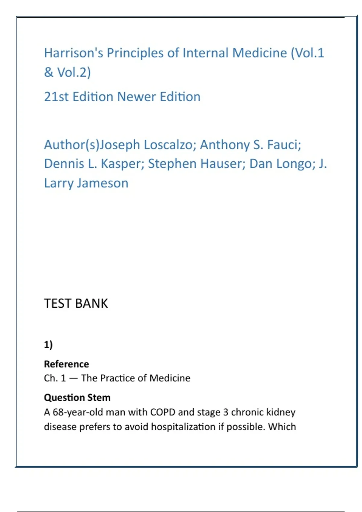Harrison’s 21st Edition Internal Medicine Test Bank — Full Textbook | 20 MCQs/Chapter, Answers & Verified Rationales Description: Master internal medicine with the definitive digital test bank built from Harrison’s Principles of Internal Medicine — 21st Edition. This premium, exam-focused resource delivers FULL textbook coverage (Vol. 1 & Vol. 2) with clinically realistic, high-yield questions designed to accelerate learning, sharpen clinical reasoning, and boost NCLEX/HESI and medical exam performance. Each chapter contains 20 original MCQs mapped to pathophysiology, diagnostics, and therapeutic decision-making—perfect for nurses, medical students, and exam candidates who need focused, practice-driven mastery. Why this test bank converts study into scores: it emphasizes application-level thinking, mirrors exam-style stems, and provides correct answers with verified, evidence-aligned rationales so learners understand why an answer is right or wrong. Use it for timed practice, targeted remediation, group study, or curriculum integration. Key features: Full textbook coverage — ALL chapters from Harrison’s 21st Edition (Vol. 1 & 2) 20 MCQs per chapter (uniform, chapter-aligned question density) Correct answers + verified rationales for every item to reinforce clinical reasoning Optimized for NCLEX-RN, HESI, shelf exams, and medical board prep Downloadable digital format for instant access and mobile study Tagged by topic, difficulty, and learning objective for efficient review Authority & trust: developed to mirror Harrison’s 21st edition content and exam frameworks, this test bank is a reliable study engine for learners pursuing internal medicine mastery and higher exam scores. Keywords: Harrison's 21st edition test bank internal medicine test bank 20 MCQs per chapter NCLEX internal medicine practice HESI exam prep internal medicine medical exam question bank clinical reasoning MCQs Harrison test bank full coverage Hashtags: #HarrisonsTestBank #InternalMedicineMCQs #NCLEXPrep #HESIPrep #MedicalExamPrep #QuestionBank #ClinicalReasoning #Pathophysiology #StudyResources #MedStudentTools