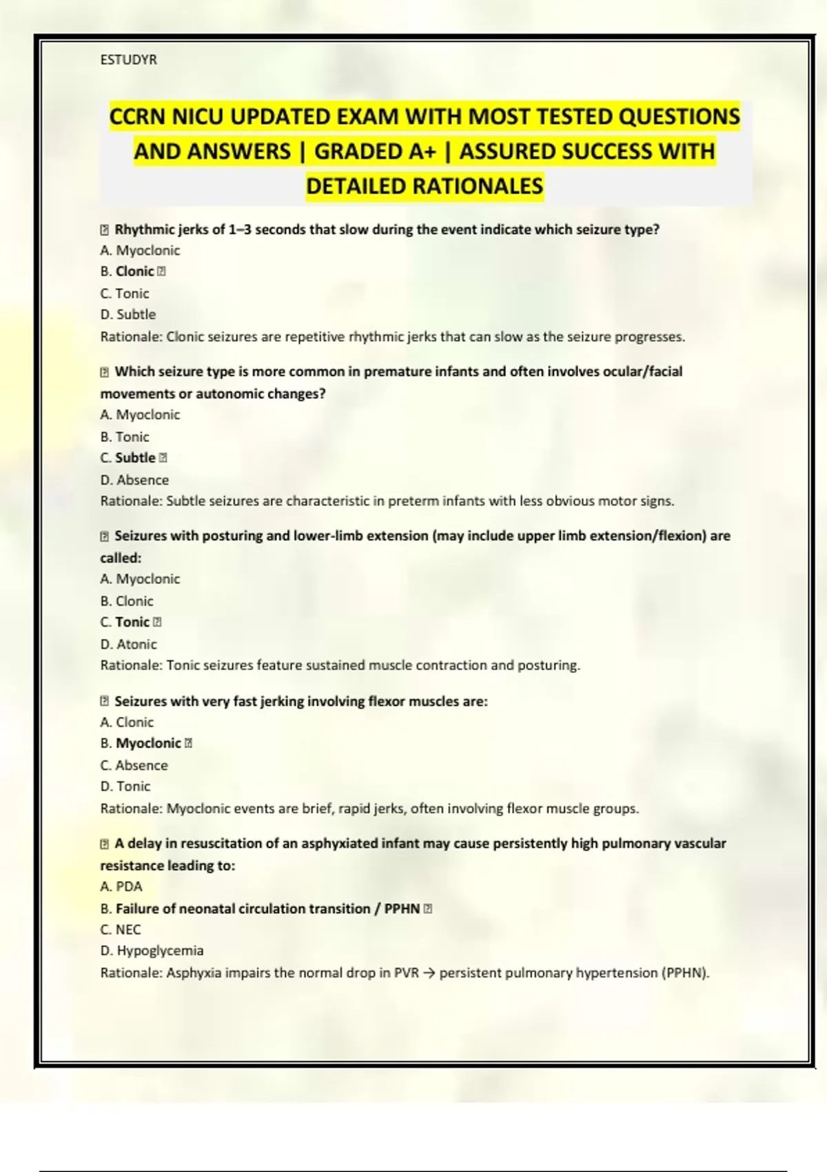 CCRN NICU UPDATED EXAM WITH MOST TESTED QUESTIONS