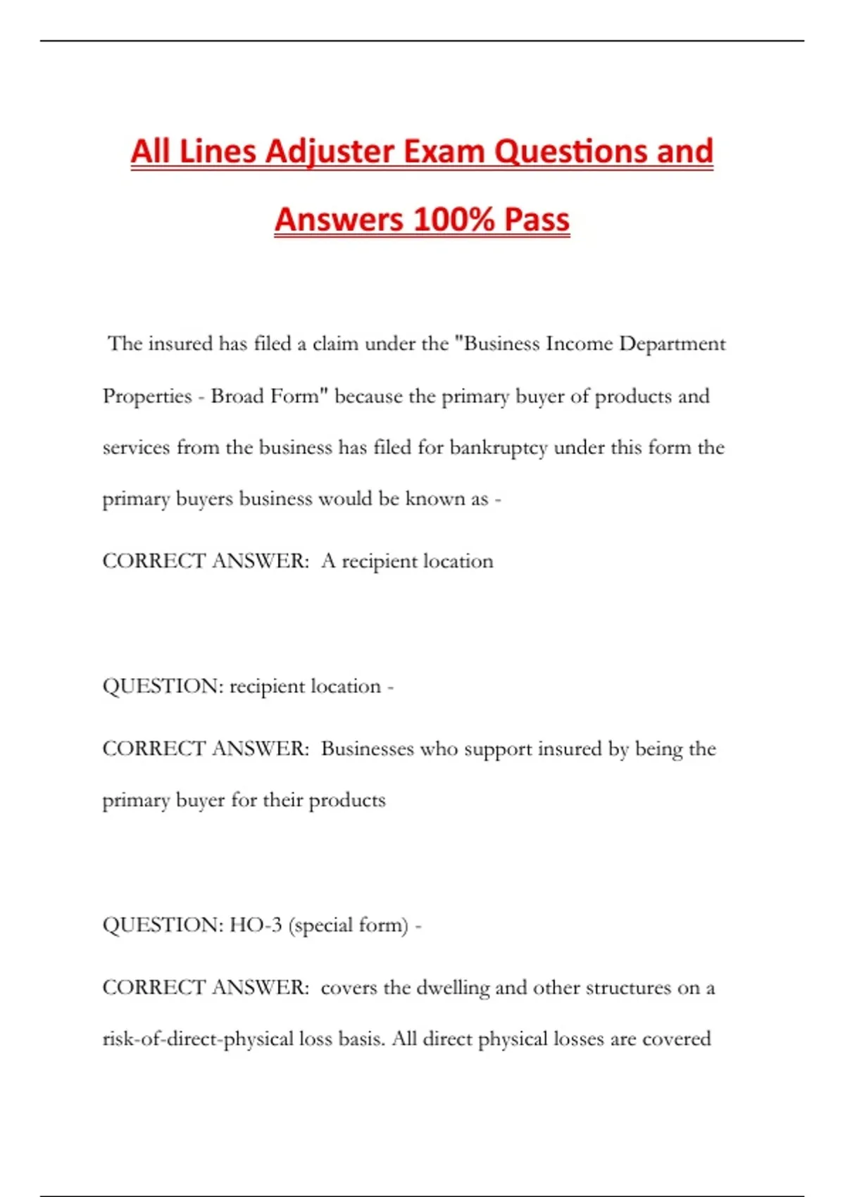 All Lines Adjuster Exam Questions and Answers 100% Pass