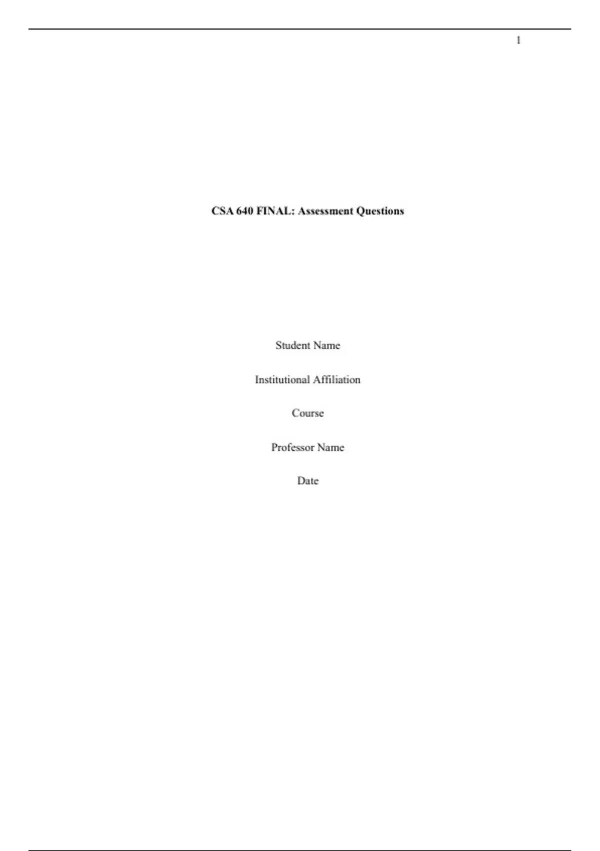 This document is a Final Assessment containing multiple-choice questions for an academic course, likely in Education, Counseling, or Applied Behavior Analysis (ABA), focusing on the principles and practice of assessment and decision-making for students, particularly those with special needs. The file provides six multiple-choice questions requiring a written rationale for each answer. The questions focus on core competencies related to educational and clinical assessment. Core Assessment Topics: Purpose of Assessment: Questions 1 and 2 explore the primary function of assessment data, highlighting that the most appropriate use is to make informed decisions about students and to facilitate decision making for services. Assessment Reporting: Question 3 addresses the ethical and practical requirements for communicating assessment results, emphasizing that they must be explained in language understandable to the child/parents. Adaptive Behavior: Questions 4 and 5 focus on the concept of adaptive behavior (functional skills for daily life) and the criteria for selecting the ideal respondent to interview about a student’s adaptive behavior. The ideal respondent is described as someone who is familiar with the student, has seen them in most contexts, and will be truthful. Data Usage: The assignment implicitly tests the student’s understanding of using data to inform academic instruction and the proper procedures for clinical testing and diagnosis, which are key principles in fields like special education and ABA.