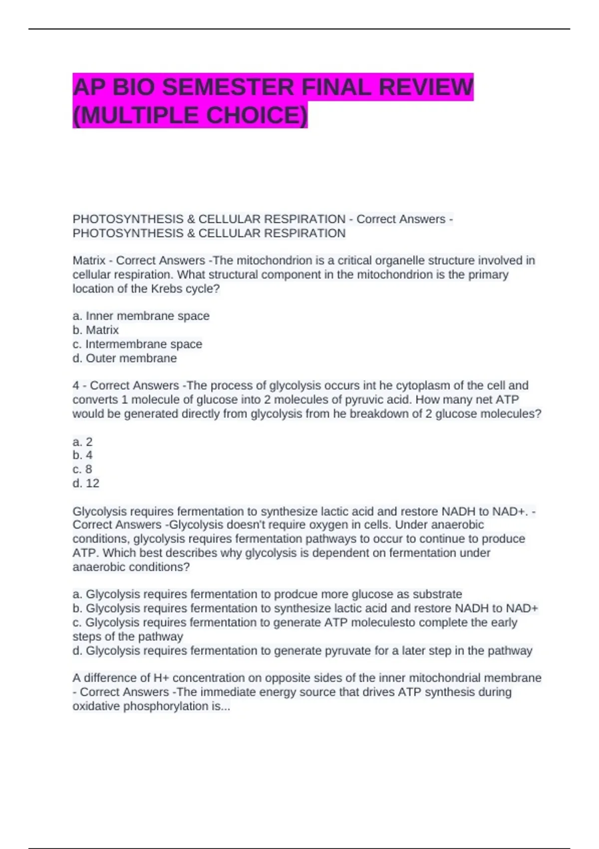 4 - Correct Answers -The process of glycolysis occurs int he cytoplasm of the cell and