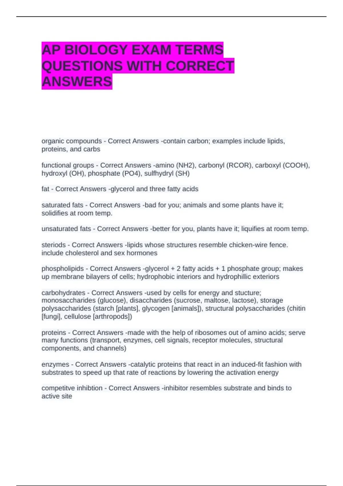 functional groups - Correct Answers -amino (NH2), carbonyl (RCOR), carboxyl (COOH),