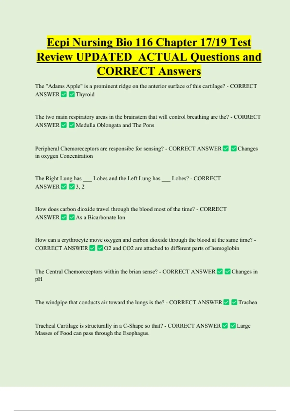 Ecpi Nursing Bio 116 Chapter 17/19 Test Review UPDATED ACTUAL Questions and CORRECT Answers