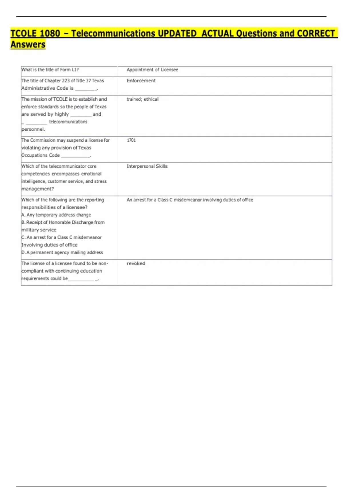 TCOLE 1080 – Telecommunications UPDATED ACTUAL Questions and CORRECT Answers