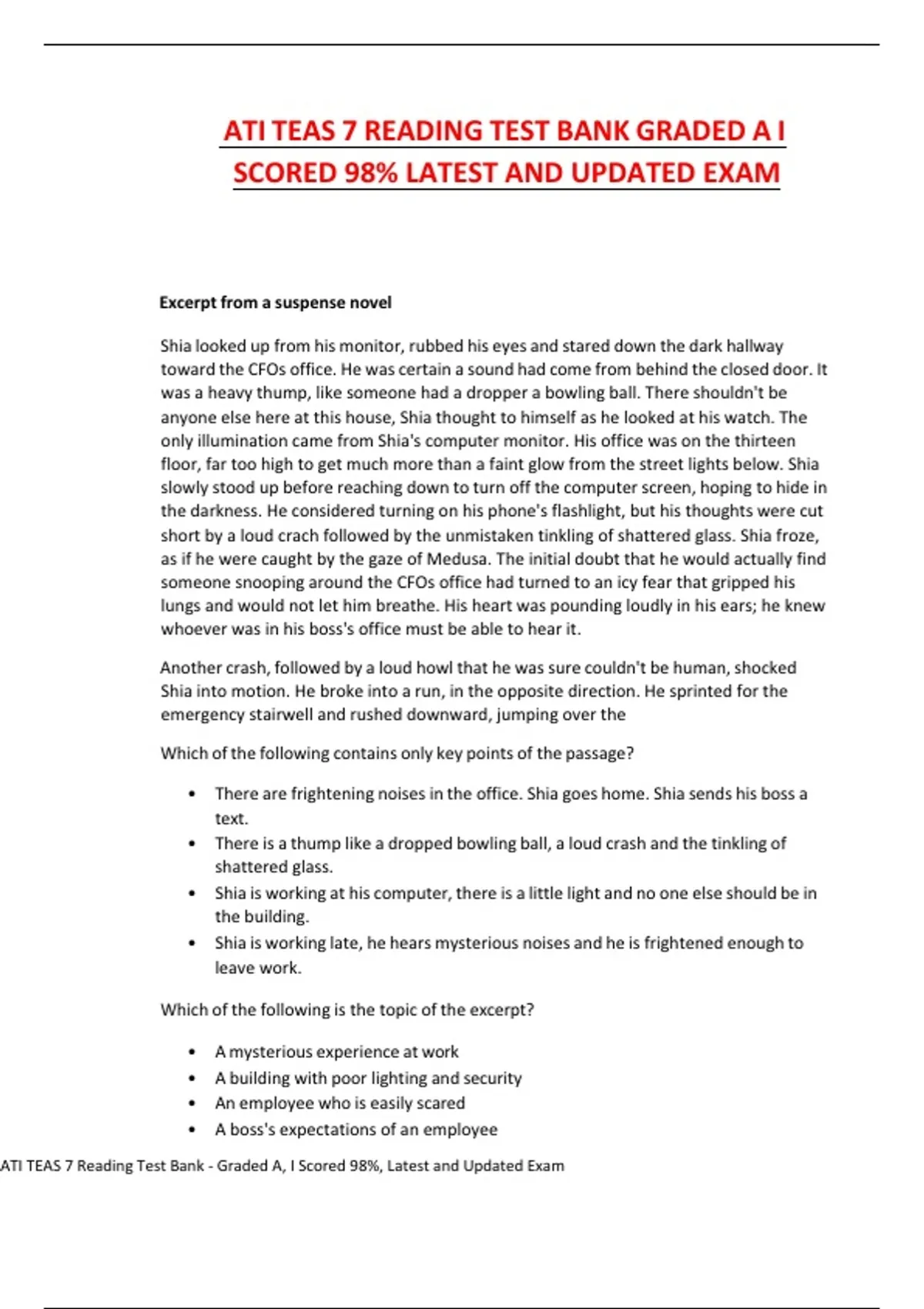 ATI TEAS 7 READING TEST BANK GRADED A I