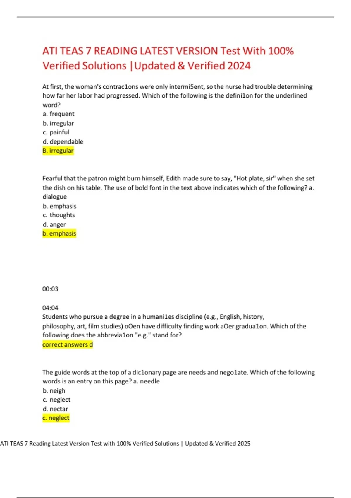 ATI TEAS 7 Reading Latest Version Test with 100- Verified Solutions Updated & Verified 2025