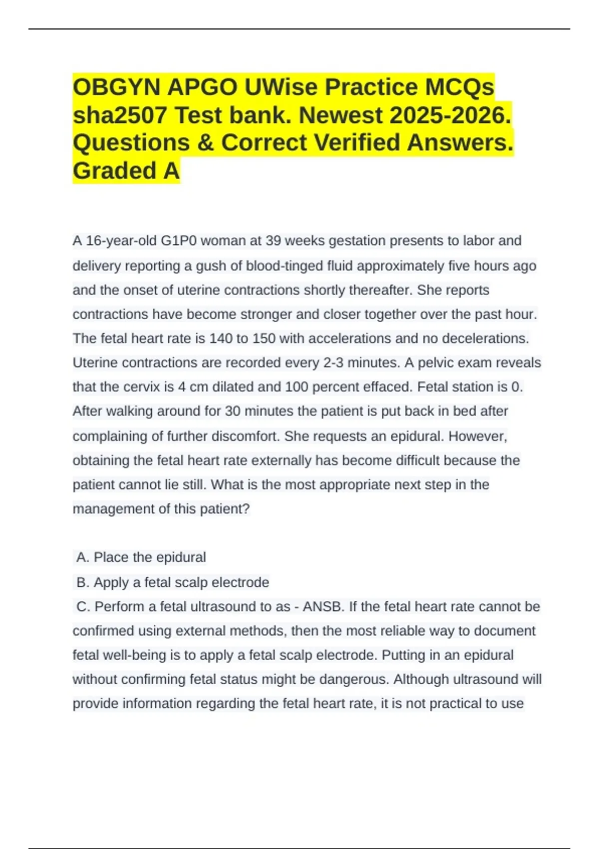 OBGYN APGO UWise Practice MCQs SHA2507 Test Bank – Newest Edition. This complete test bank features all practice questions along with their verified correct answers, carefully compiled to ensure accuracy and relevance for the academic year. Each question has been reviewed and graded, providing students with a reliable and thorough study resource. Graded A for quality, this test bank is an essential tool to enhance learning and maximize exam performance.