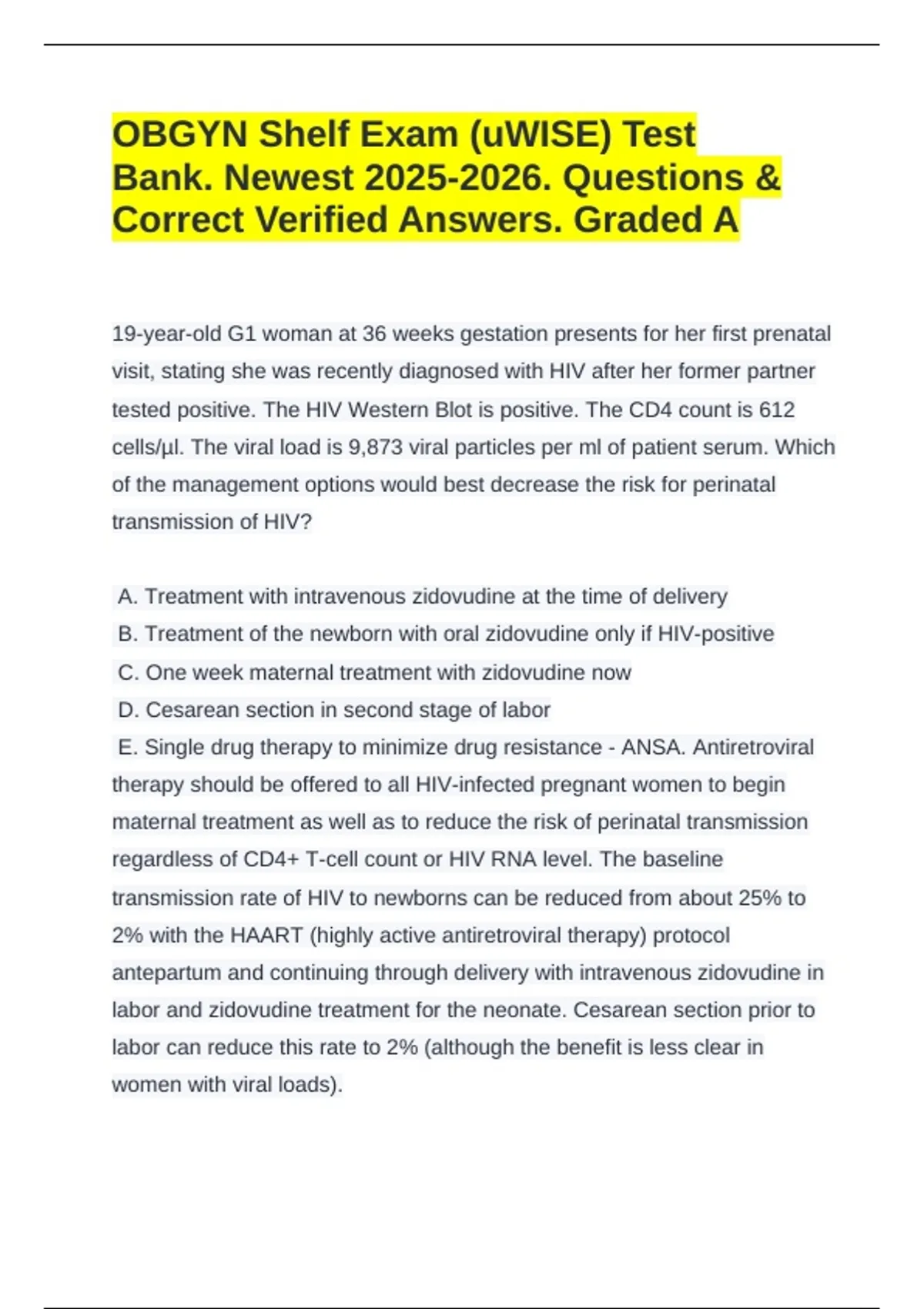 OBGYN Shelf Exam (UWise) Test Bank – Newest Edition. This comprehensive test bank contains all shelf exam questions along with their verified correct answers, meticulously compiled to ensure accuracy and alignment with the academic curriculum. Each question has been thoroughly reviewed and graded, providing students with a reliable and complete study resource. Graded A for quality, this test bank is an essential tool to enhance understanding and maximize exam performance.