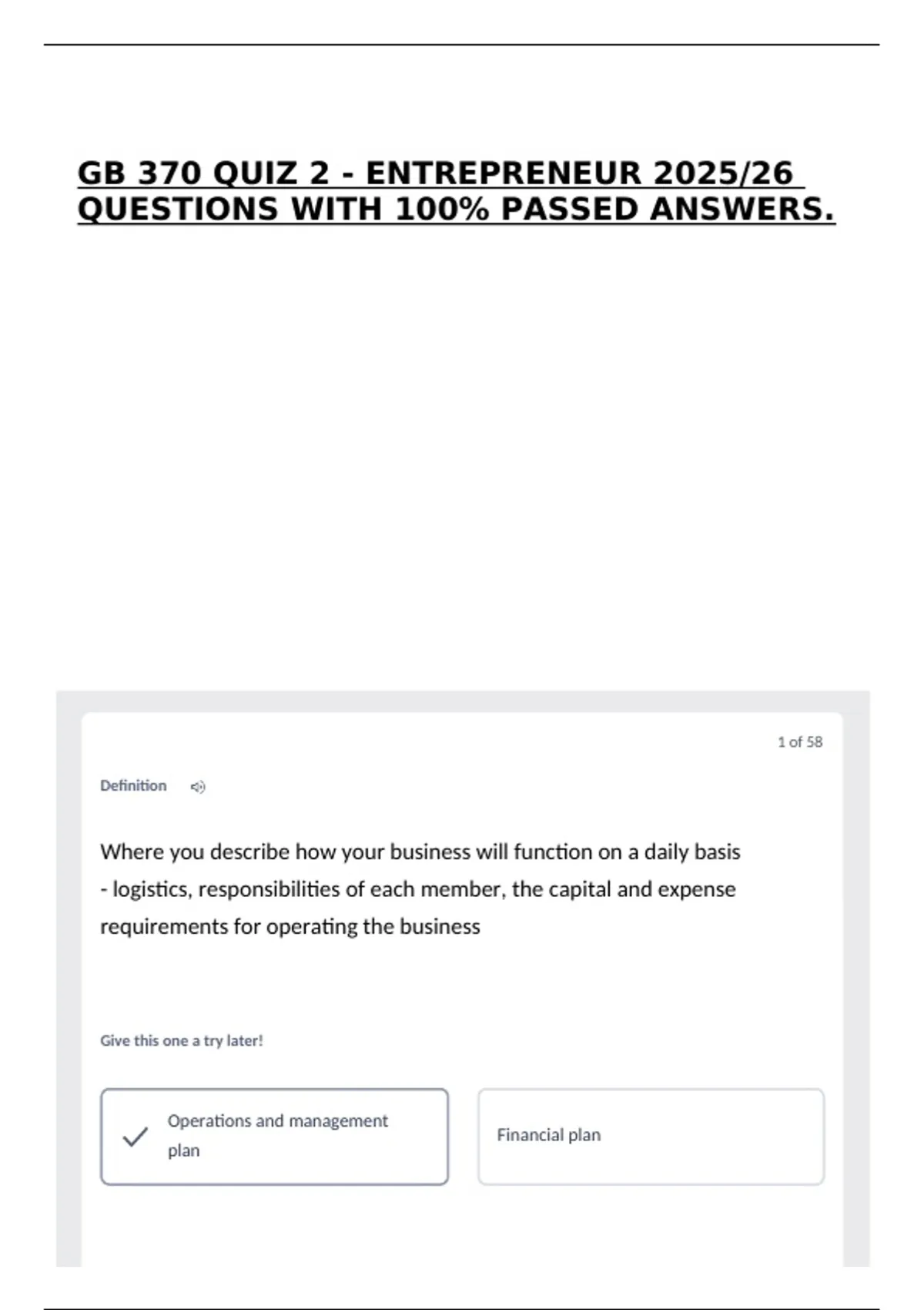 GB 370 QUIZ 2 - ENTREPRENEUR 2025/26 QUESTIONS WITH 100% PASSED ANSWERS.