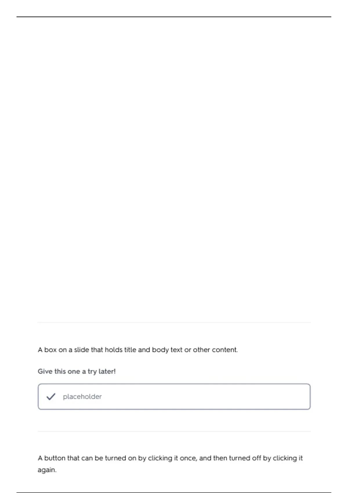A box on a slide that holds title and body text or other content.