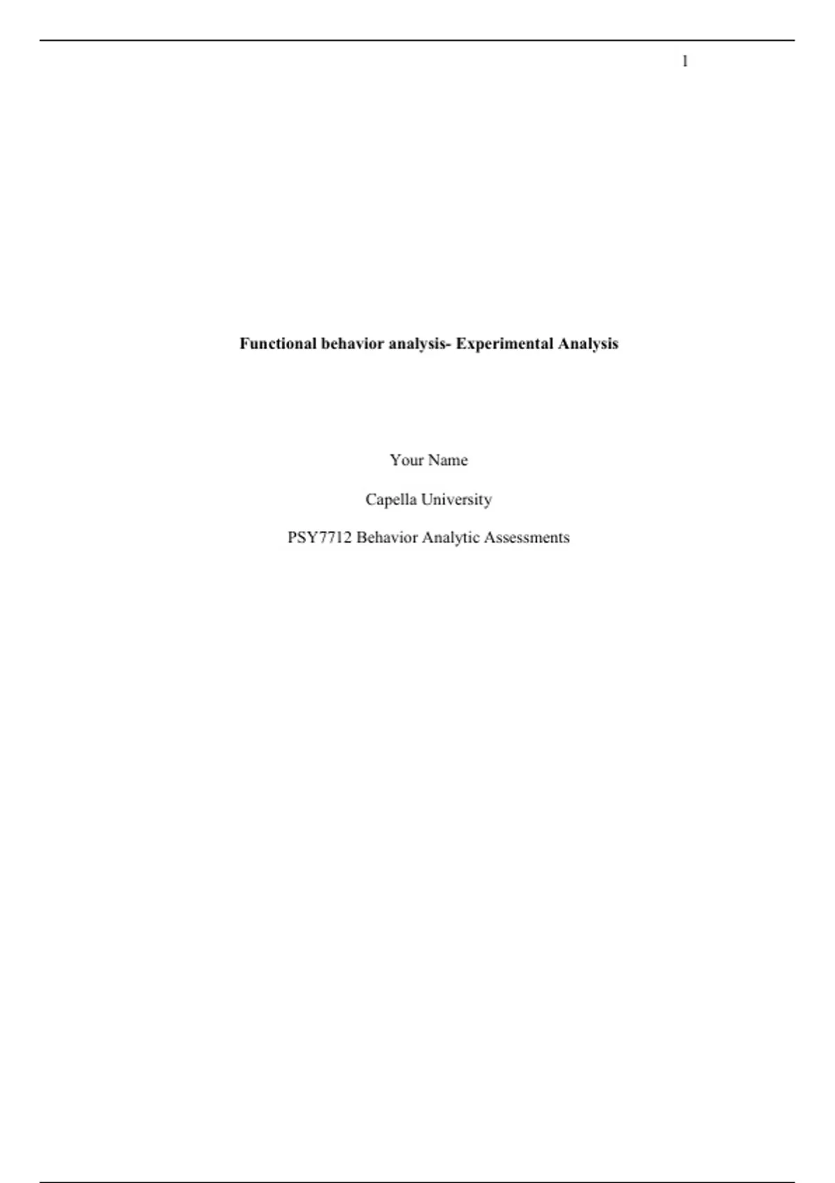 This document is a research paper for a Behavior Analytic Assessments course (PSY7712) focused on conducting a Functional Behavior Analysis (FBA) using the Interview-Informed Synthesized Contingency Analysis (IISCA) method. The paper selects a target behavior, justifies the method, outlines its benefits and limitations, details the experimental conditions, and presents hypothetical data and conclusions for a client named Lee who exhibits Self-Injurious Behavior (SIB). Key Content Areas:1. Rationale for Experimental Analysis (IISCA)Method Selected: Interview-Informed Synthesized Contingency Analysis (IISCA)1.Objective: To gather information on the potential meaning (function) of the behavior, such as seeking attention, escaping demands, or accessing needs2.Benefits:Comprehensive: Incorporates interviews and experimental analysis, collecting in-depth data from people close to the child3.Flexible: Easily adopted into different settings and populations, providing individualized behavioral insights4.Efficient: Quicker and less invasive than other functional analysis methods, which is useful with limited resources and time5.Limitations:Relies on individual accuracy: Heavily dependent on interview data from caregivers and teachers, which is prone to potential biases and may not reflect actual functional behavior6.Variations in behavioral responses: Interviewees may respond differently in an analysis setting compared to real-life situations, leading to less accurate and less applicable results7.Limited to observable behavior: Overlooks complex, underlying emotional and cognitive contributors, examining only easily observed and quantified behavior8.2. Target Behavior and RationaleTarget Behavior: To reduce and eliminate instances of Self-Injurious Behavior (SIB) when client Lee faces frustrating moments9.Specific SIB Examples: Pulling hair, punching arms, and occasionally hitting his head10.Rationale for IISCA: It allows for precise function identification by manipulating antecedents and outcomes, which leads to more precise, reliable, and personalized interventions than generic behavioral management measures. It can also observe and measure more than one contingency12.3. Experimental ConditionsThe paper details the conditions for both a Single-Contingency Functional Analysis (excluding TBFA) and the Synthesized Contingencies Functional Analysis (IISCA).Single-Contingency Conditions: Control, Tangible (accessing items), Demand (escaping tasks), Attention (receiving social interaction), and Alone (automatic reinforcement)1414.Each condition is defined by its purpose, duration (5-15 minutes), available stimuli, and specific procedures to evoke and abate the problem behavior (PB).IISCA Conditions (Synthesized): Includes $R_{1s}$ (Access preferred items), $R_{2s}$ (Neutral environment/baseline), and HRE (Safe environment for high-risk SIB)16.4. Hypothetical Data and ConclusionData Visualization: The document includes a hypothetical graph (Figure 1) of the data collected.Conclusion: The most problematic behavior (PB) occurred when a change or task was demanded from Lee (e.g., asking him to go for lunch or changing games)18. PB also occurred when he was left alone without much to do (automatic reinforcement)19. Restoring or giving him preferred toys and activities reduced the occurrences of PB20. The recommendation is for caregivers to use toys and encourage preferred activities to help Lee avoid SIB21.