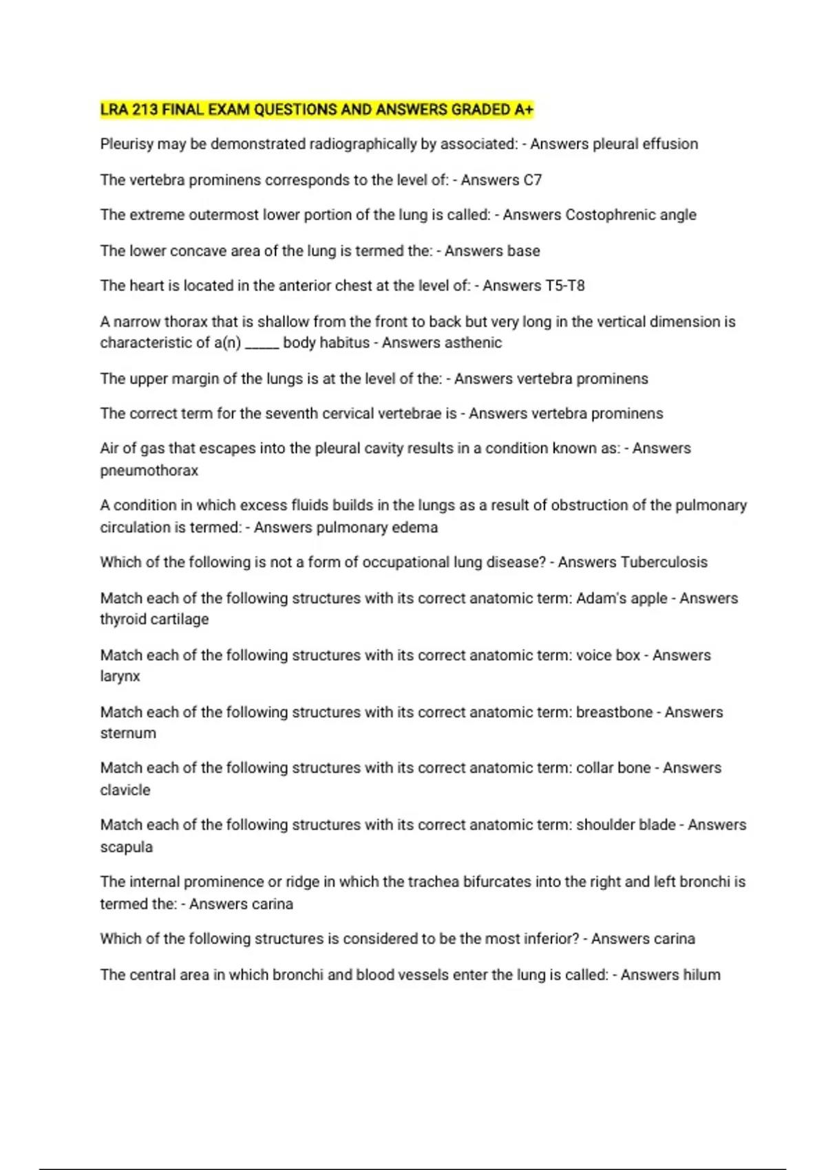 LRA 213 FINAL EXAM QUESTIONS AND ANSWERS GRADED A+ Pleurisy may be demonstrated radiographically by associated: - Answers pleural effusion The vertebra prominens corresponds to the level of: - Answers C7 The extreme outermost lower portion of the lung is called: - Answers Costophrenic angle The lower concave area of the lung is termed the: - Answers base The heart is located in the anterior chest at the level of: - Answers T5-T8 A narrow thorax that is shallow from the front to back but very long in the vertical dimension is characteristic of a(n) _____ body habitus - Answers asthenic The upper margin of the lungs is at the level of the: - Answers vertebra prominens The correct term for the seventh cervical vertebrae is - Answers vertebra prominens Air of gas that escapes into the pleural cavity results in a condition known as: - Answers pneumothorax A condition in which excess fluids builds in the lungs as a result of obstruction of the pulmonary circulation is termed: - Answers pulmonary edema Which of the following is not a form of occupational lung disease? - Answers Tuberculosis Match each of the following structures with its correct anatomic term: Adam's apple - Answers thyroid cartilage Match each of the following structures with its correct anatomic term: voice box - Answers larynx Match each of the following structures with its correct anatomic term: breastbone - Answers sternum Match each of the following structures with its correct anatomic term: collar bone - Answers clavicle Match each of the following structures with its correct anatomic term: shoulder blade - Answers scapula The internal prominence or ridge in which the trachea bifurcates into the right and left bronchi is termed the: - Answers carina Which of the following structures is considered to be the most inferior? - Answers carina The central area in which bronchi and blood vessels enter the lung is called: - Answers hilum a well-inspired average adult chest pa projection will have a minimum of ___ posterior ribs seen above the diaphragm - Answers 10 The bony thorax consists of (A) the single ___ anteriorly, (B) two ___, (C) two ___, (D) twelve pairs of ___, and (E) twelve ___ posteriorly - Answers (A) Sternum (B) Clavicles (C) Scapulae (D) Ribs (E) Thoracic vertebrae The two important bony landmarks of the thorax that are used for locating the central ray on a posteroanterior (PA) and anteroposterior (AP) chest projections are the (A) ____ and the (B) _____, respectively - Answers (A) Vertebra prominens (B) Juglular notch The four divisions of the respiratory system are: - Answers Pharynx, Trachea, Bronchi and Lungs List the three divisions of the structure located proximally to the larynx that serve as a common passageway for both food and air - Answers Alasopharynx, Oropharynx, and Laryngopharynx What is the name of the structure that acts as a lid over the larynx to prevent foreign objects such as food particles from entering the respiratory system? - Answers Epiglottis The trachea is located ___ to the esophagus. - Answers Anteriorly The ___ bone is seen in the anterior portion of the neck and is found just below the tongue o