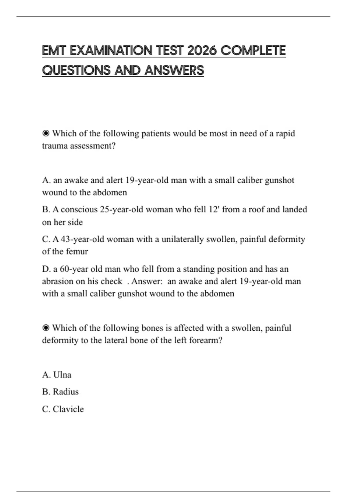 EMT EXAMINATION TEST 2026 COMPLETE QUESTIONS AND ANSWERS