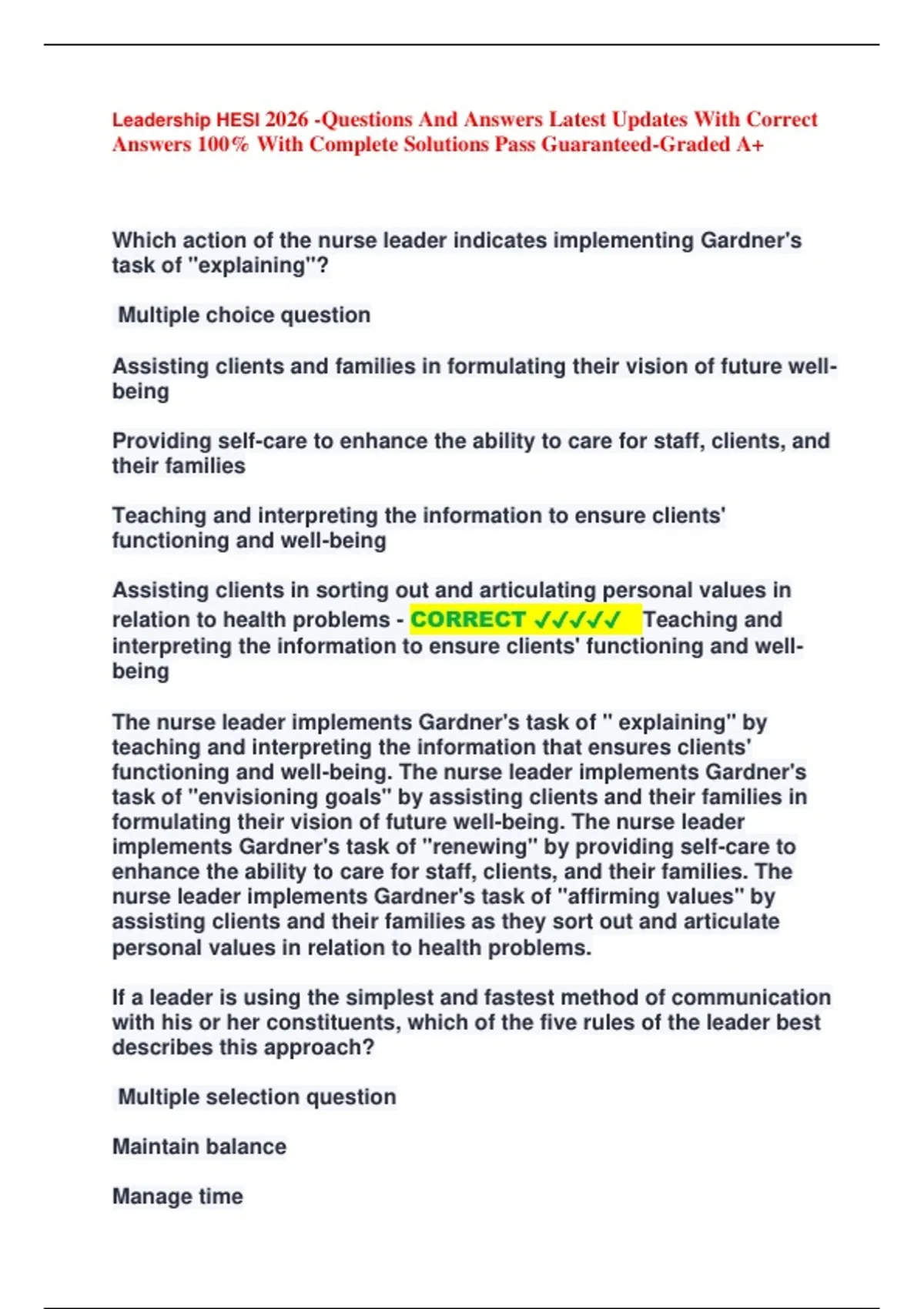 The nurse leader implements Gardner's task of " explaining" by