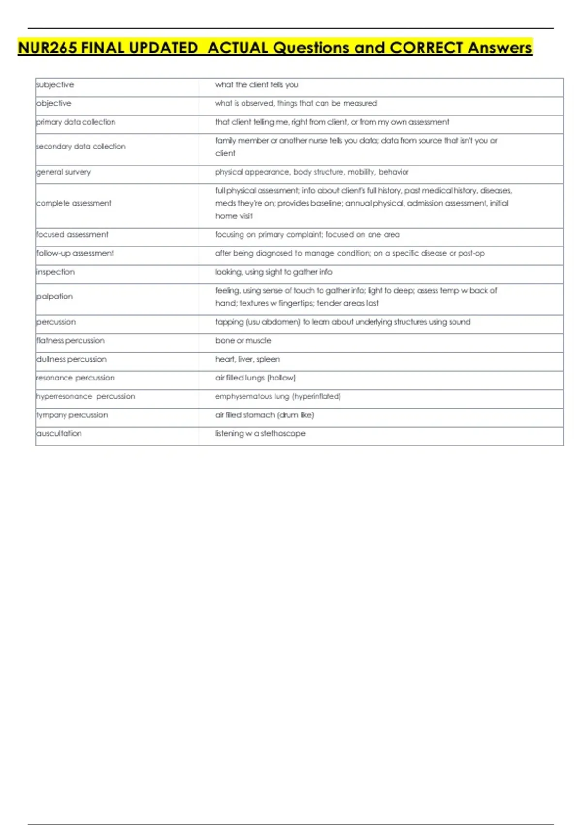 full physical assessment; info about client's full history, past medical history, diseases,