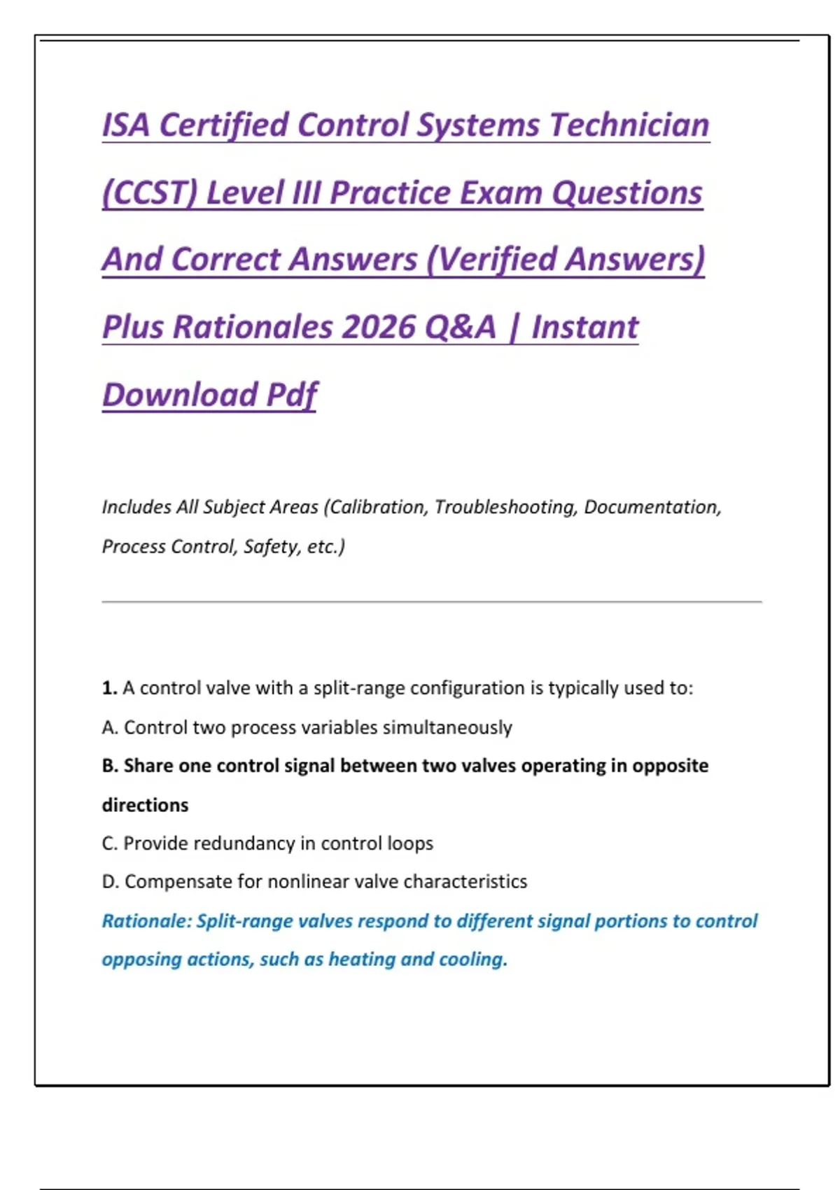ISA Certified Control Systems Technician (CCST) Level III Practice Exam Questions And Correct Answers (Verified Answers) Plus Rationales 2026 Q&A | Instant Download Pdf