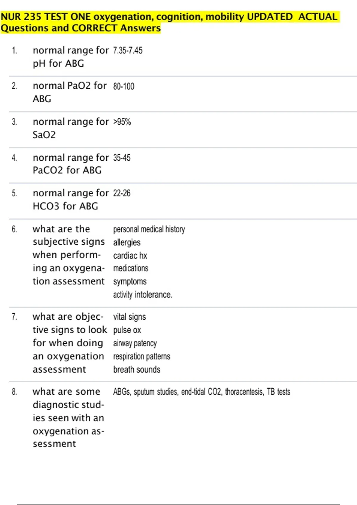 NUR 235 TEST ONE oxygenation, cognition, mobility UPDATED ACTUAL