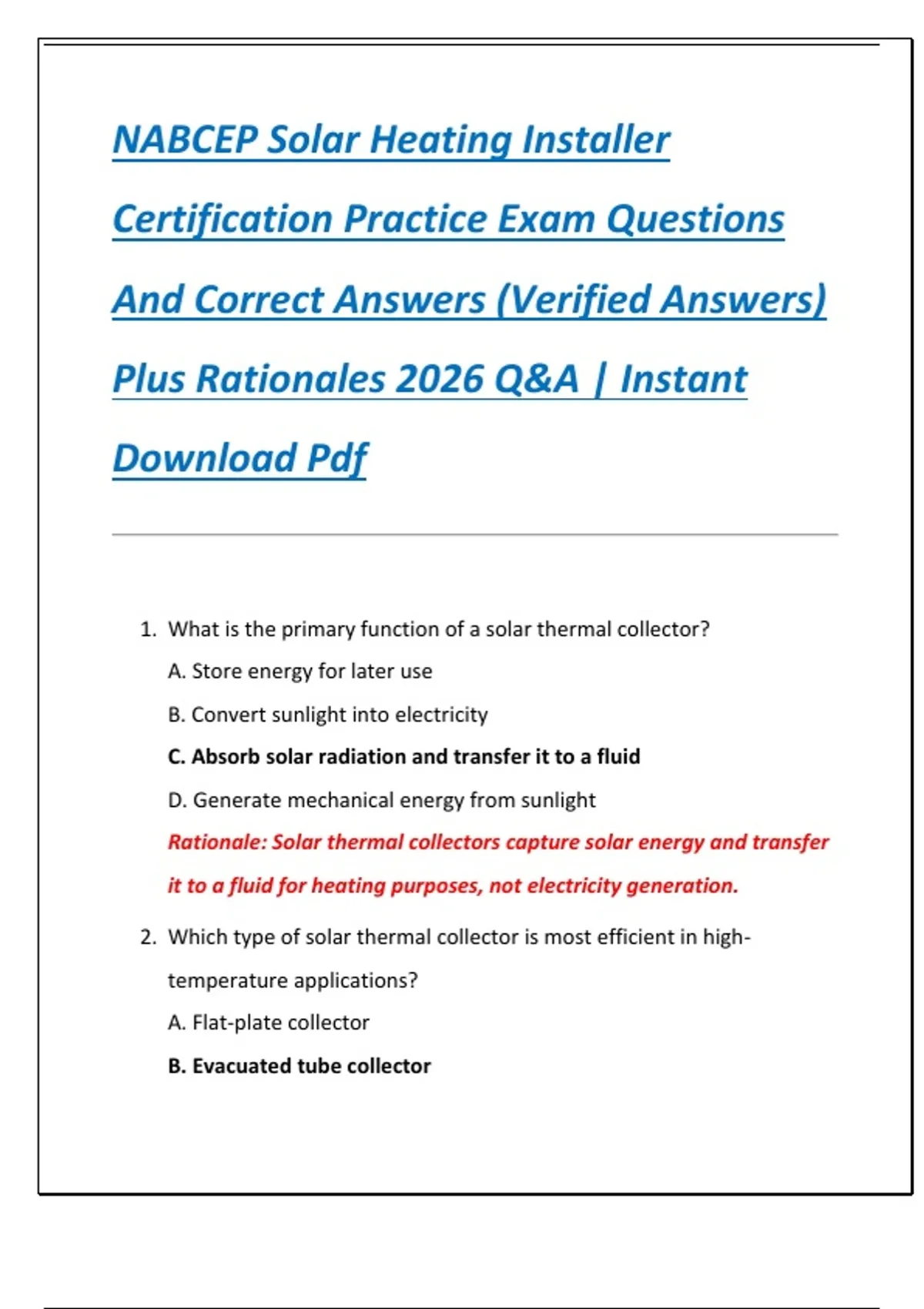 NABCEP Solar Heating Installer Certification Practice Exam Questions And Correct Answers (Verified Answers) Plus Rationales 2026 Q&A | Instant Download Pdf