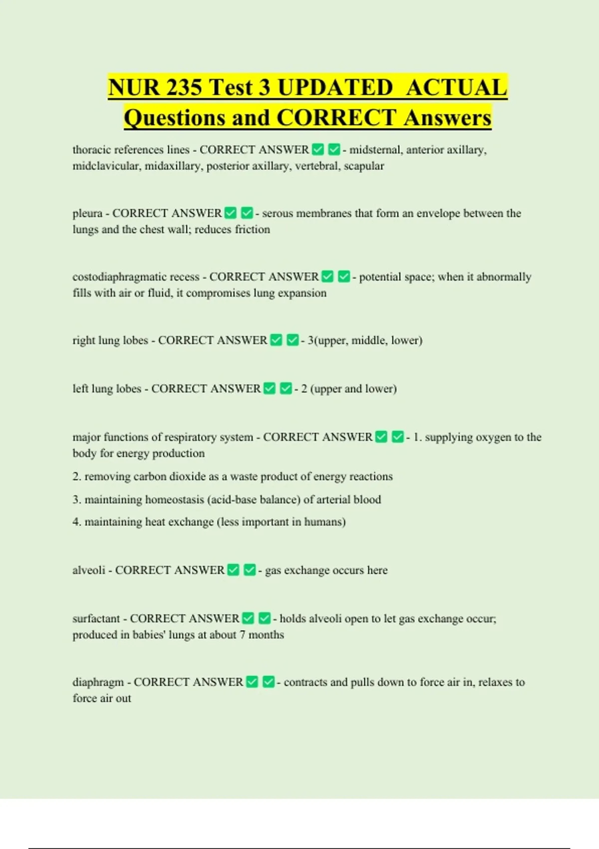 surfactant - CORRECT ANSWER - holds alveoli open to let gas exchange occur;