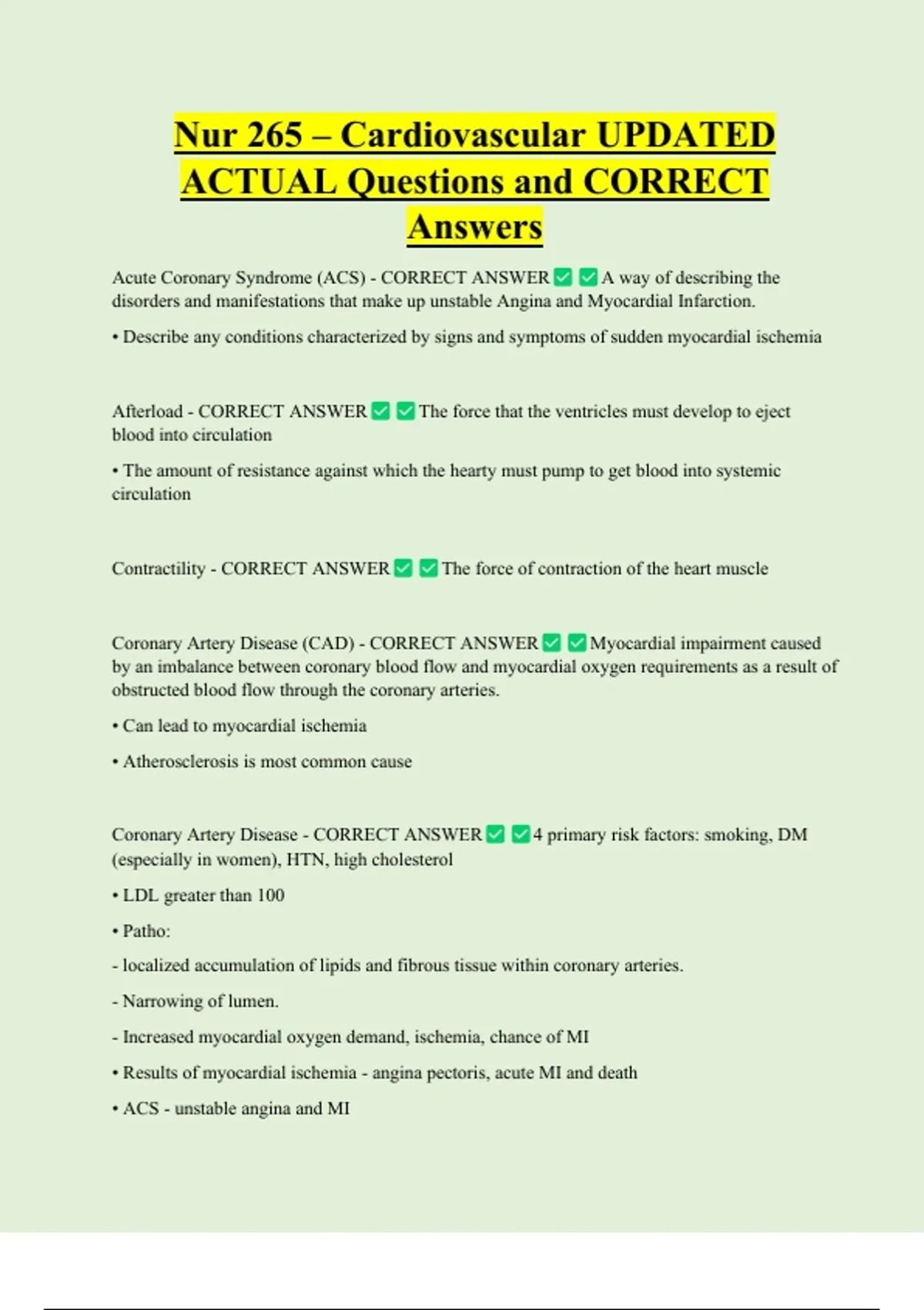 Nur 265 – Cardiovascular UPDATED ACTUAL Questions and CORRECT Answers