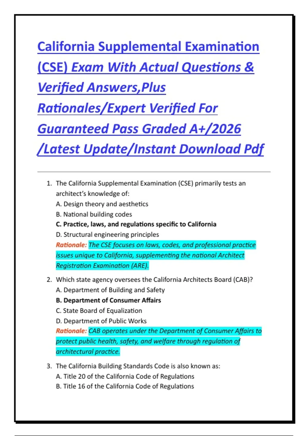 1. The California Supplemental Examination (CSE) primarily tests an