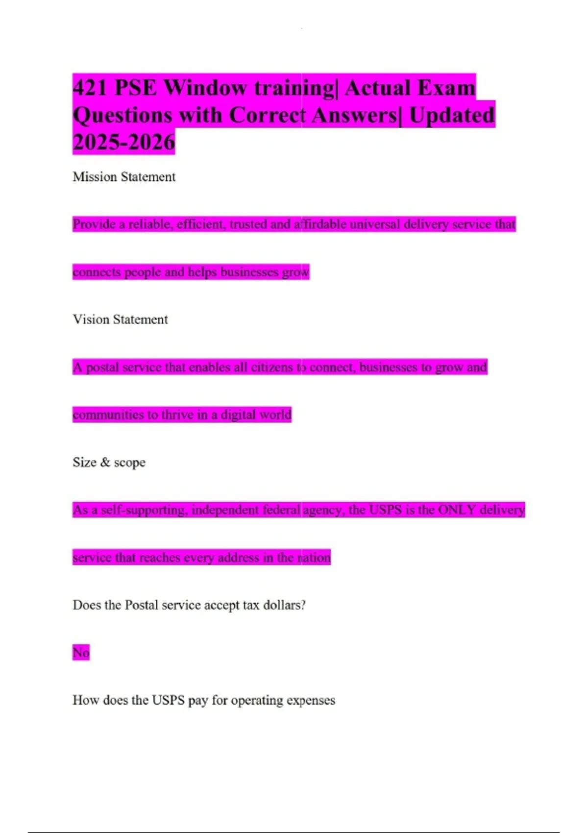 421 PSE Window training| Actual Exam Questions with Correct Answers| Updated Mission Statement Provide a reliable, efficient, trusted and affirdable universal delivery service that connects people and helps businesses grow Vision Statement A postal service that enables all citizens to connect, businesses to grow and communities to thrive in a digital world Size & scope As a self-supporting, independent federal agency, the USPS is the ONLY delivery service that reaches every address in the nation Does the Postal service accept tax dollars? No How does the USPS pay for operating expenses Sale of postage, products, and services Postal Service core set of enduring goals Deliver High Quality Services, Provide world-class customer experience, ensure safe workplace and an engaged workforce What agency has been consistently been rated as the #1 agency Americans trust to protect their privacy The Postal Service What are the issues related to security and sanctity of the mail Theft, Destruction or damage of mail, delay of mail, opening US Postal Inspection Service Protects mail system- investigates postal offenses and postal related civil matters Who empowered the US Postal Inspection Service? Congress Who is the primary law enforcement arm of the Postal Service USPIS- US Postal Inspection Service Office of Inspector General Money-theft from employees- maintains the integrity and accountability of America's postal service, it's revenue and assets, and it's employees Functional Purpose Providing service in a way that delivers a world-class customer experience before and after the sale in order to drive repeat business, customer loyalty, and revenue