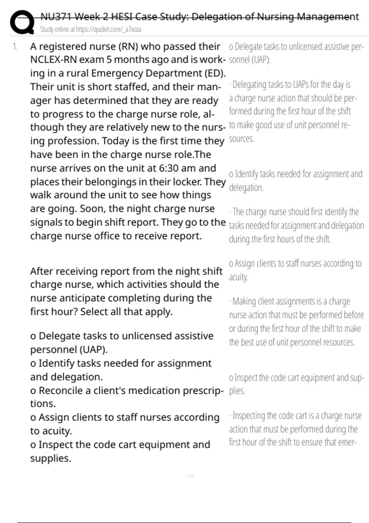 , NU371 Week 2 HESI Case Study: Delegation of Nursing Management