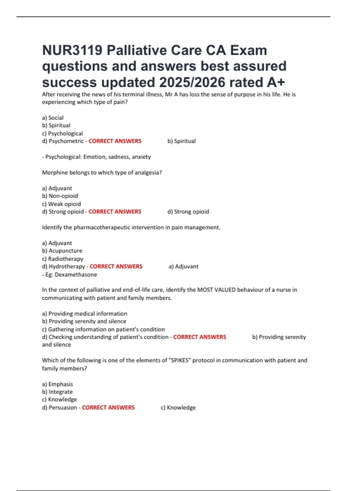 d) Physical, Psychological, Social and Spiritual - CORRECT ANSWERS d) Physical, Psychological,