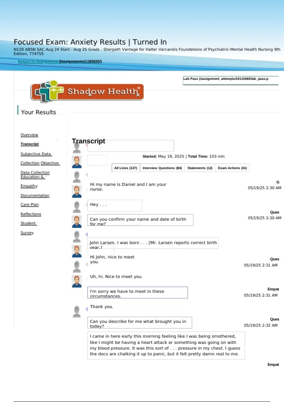 N129 ABSN SAC Aug 24 Start - Aug 25 Grads - Sherpath Vantage for Halter Varcarolis Foundations of Psychiatric-Mental Health Nursing 9th