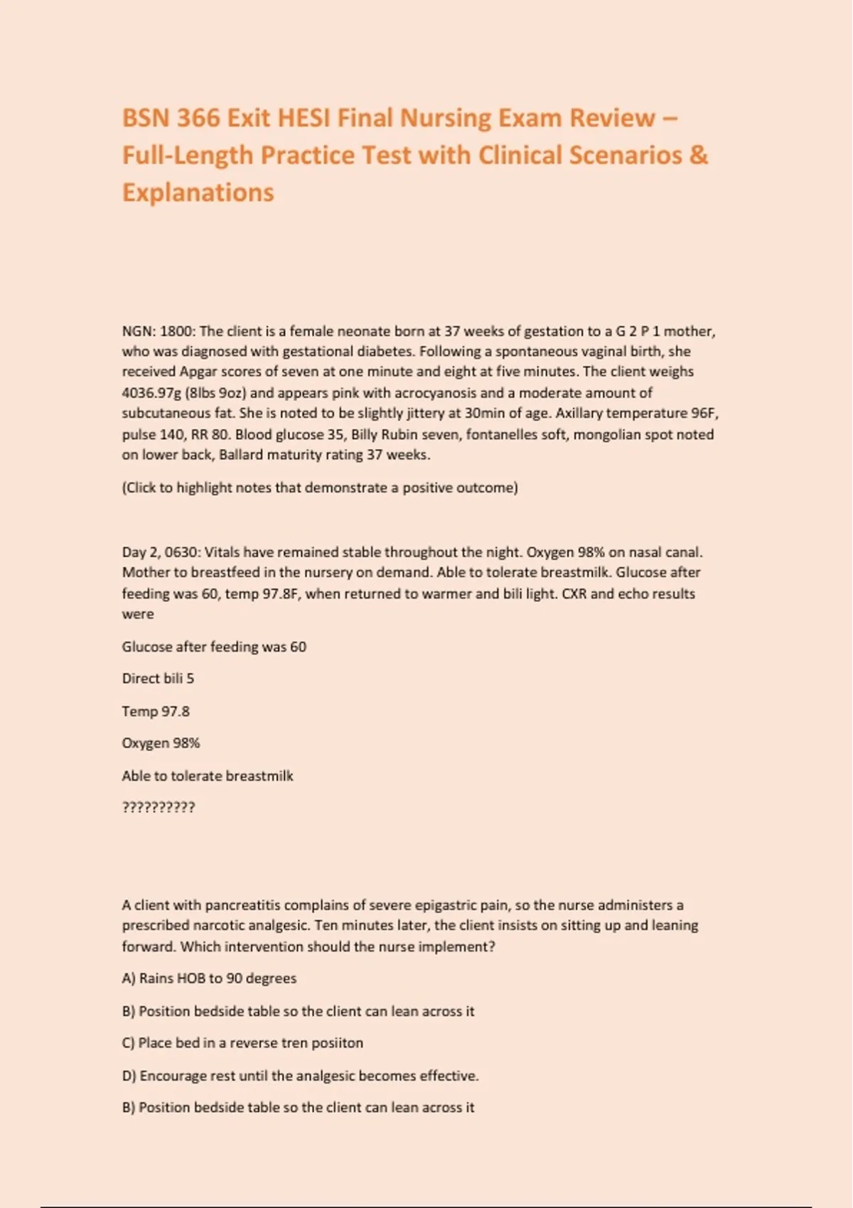 BSN 366 Exit HESI Final Nursing Exam Review – Full-Length Practice Test with Clinical Scenarios & Explanations