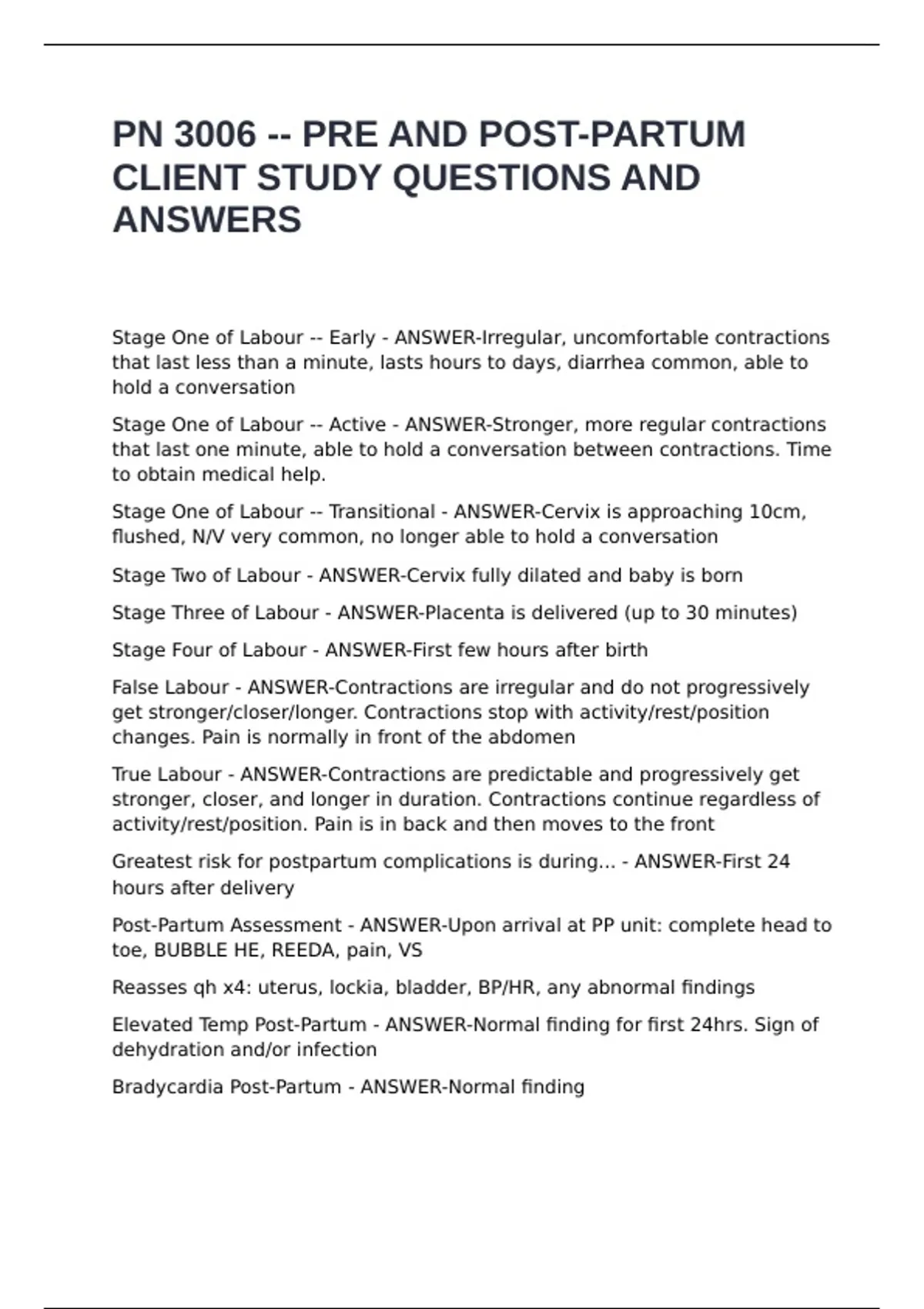 PN 3006 -- PRE AND POST-PARTUM CLIENT STUDY QUESTIONS AND ANSWERS